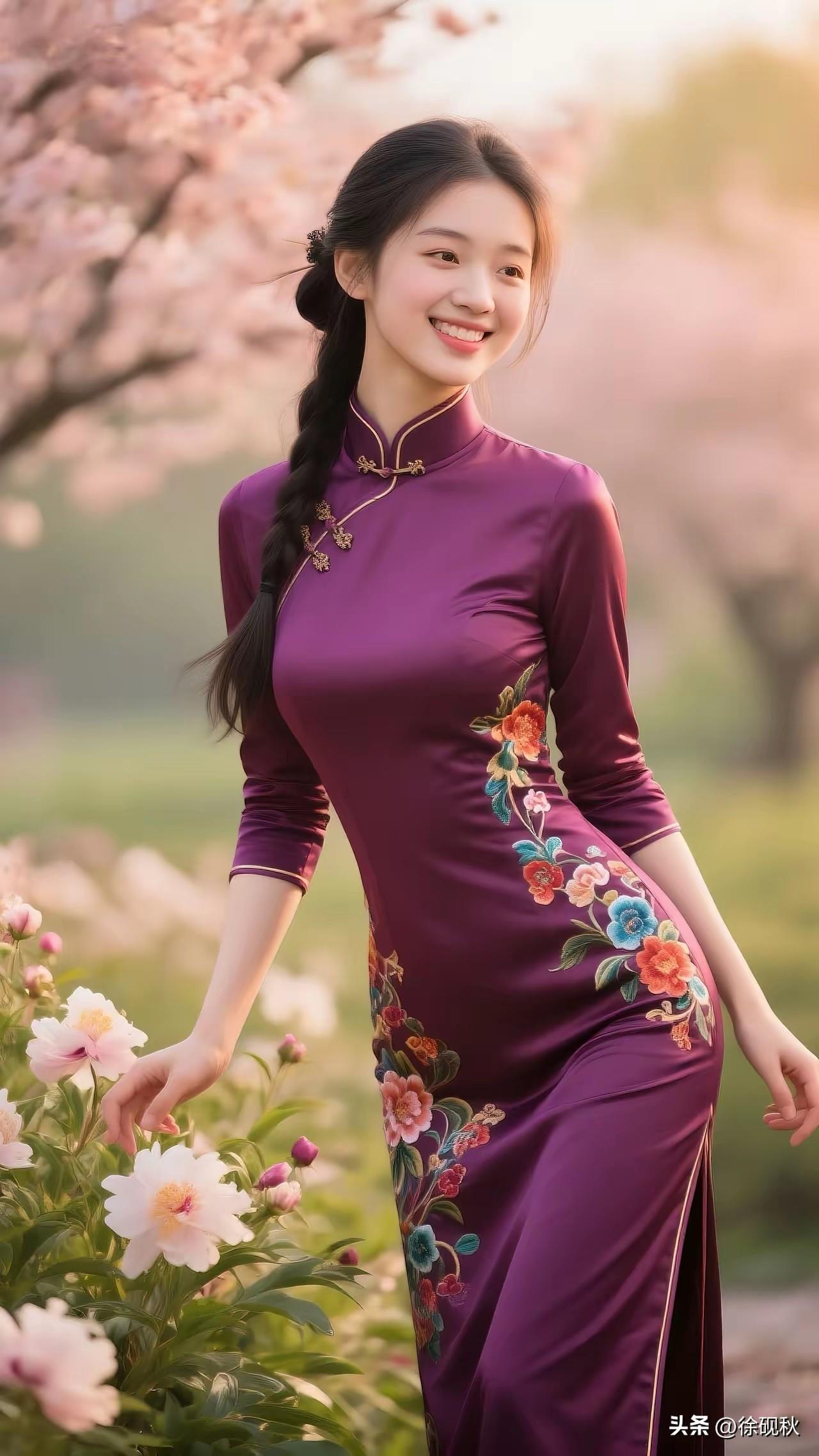 紫色旗袍,风韵独特。 贴身裁剪,凸显性感。 大家闺秀,小家碧玉。 身姿妙曼,风情妩媚。 嫣然一笑,倾国倾城。