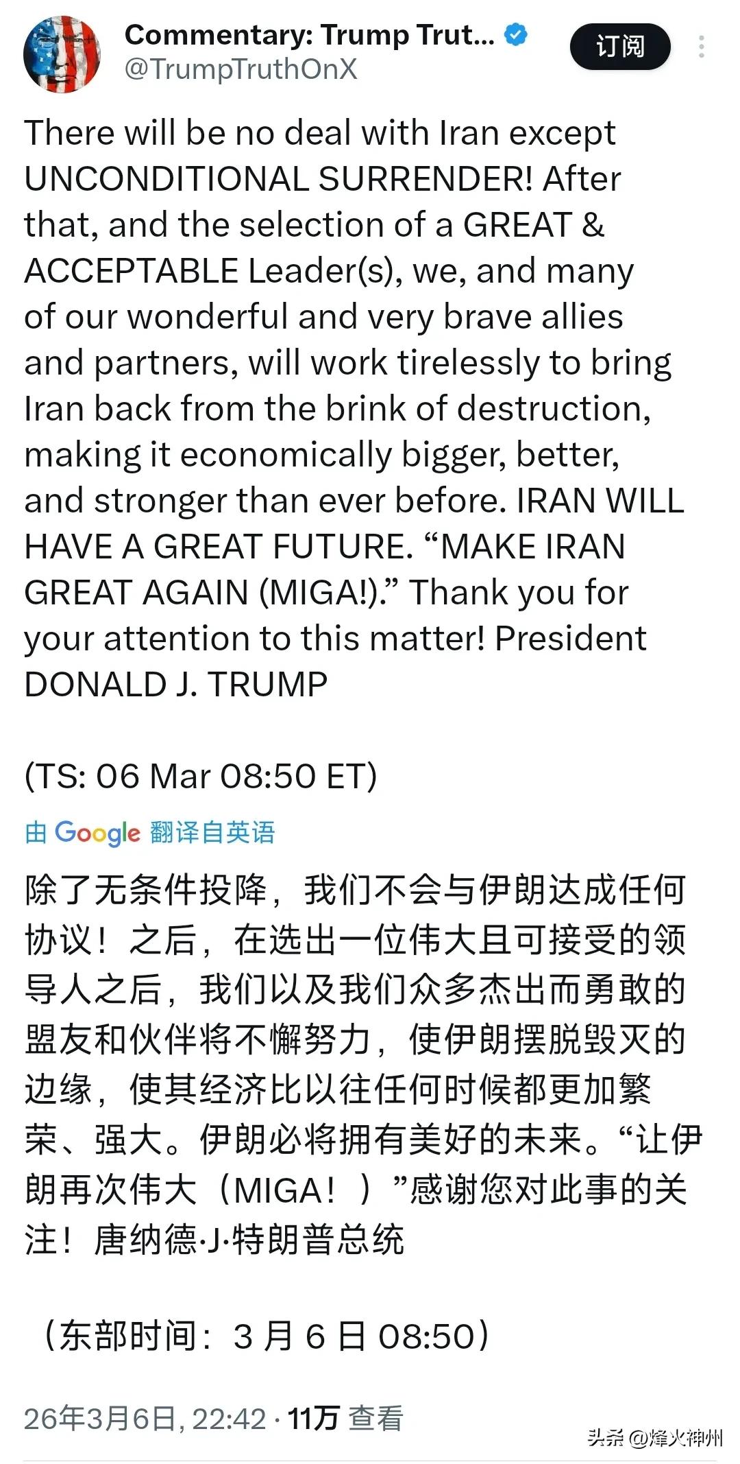 特朗普昨晚(北京时间3月6日晚)发文写道:“除了无条件投降,我们不会与伊朗达成任何协议!之后,在选出一位伟大且可接受的领导人之后,我们以及我们众多杰出而勇敢的盟友和伙伴将不懈努力,使伊朗摆脱毁灭的边缘,使其经济比以往任何时候都更加繁荣、强大。伊朗必将拥有美好的未来。‘让伊朗再次伟大(MIGA!)’感谢您对此事的关注!” 评几句: 特朗普扬言伊朗必须无条件投降,还狂妄宣称要为伊朗选定“可接受的领导人”,甚至炮制“让伊朗再次伟大”的口号,这番表演将美式霸权的蛮横与虚伪展现得淋漓尽致。 所谓“拯救伊朗”,不过是侵略与颠覆的遮羞布。美国在中东肆意发动打击、制造战乱,让地区满目疮痍,如今却扮成“救世主”,逻辑何其荒诞。特朗普要求伊朗投降,本质是粗暴干涉主权、强行实施政权更迭,完全无视国际法与国际公理。 “MIGA”的口号看似动听,实则是控制伊朗、掠夺资源的政治话术。真正能决定伊朗未来的,只有伊朗人民,绝不是远在大洋彼岸的美国政客。 这种威胁加忽悠的套路,早已被国际社会看穿。特朗普的狂言,只会让地区局势更加危险,也让全世界看清:美国才是中东动荡的最大祸根。