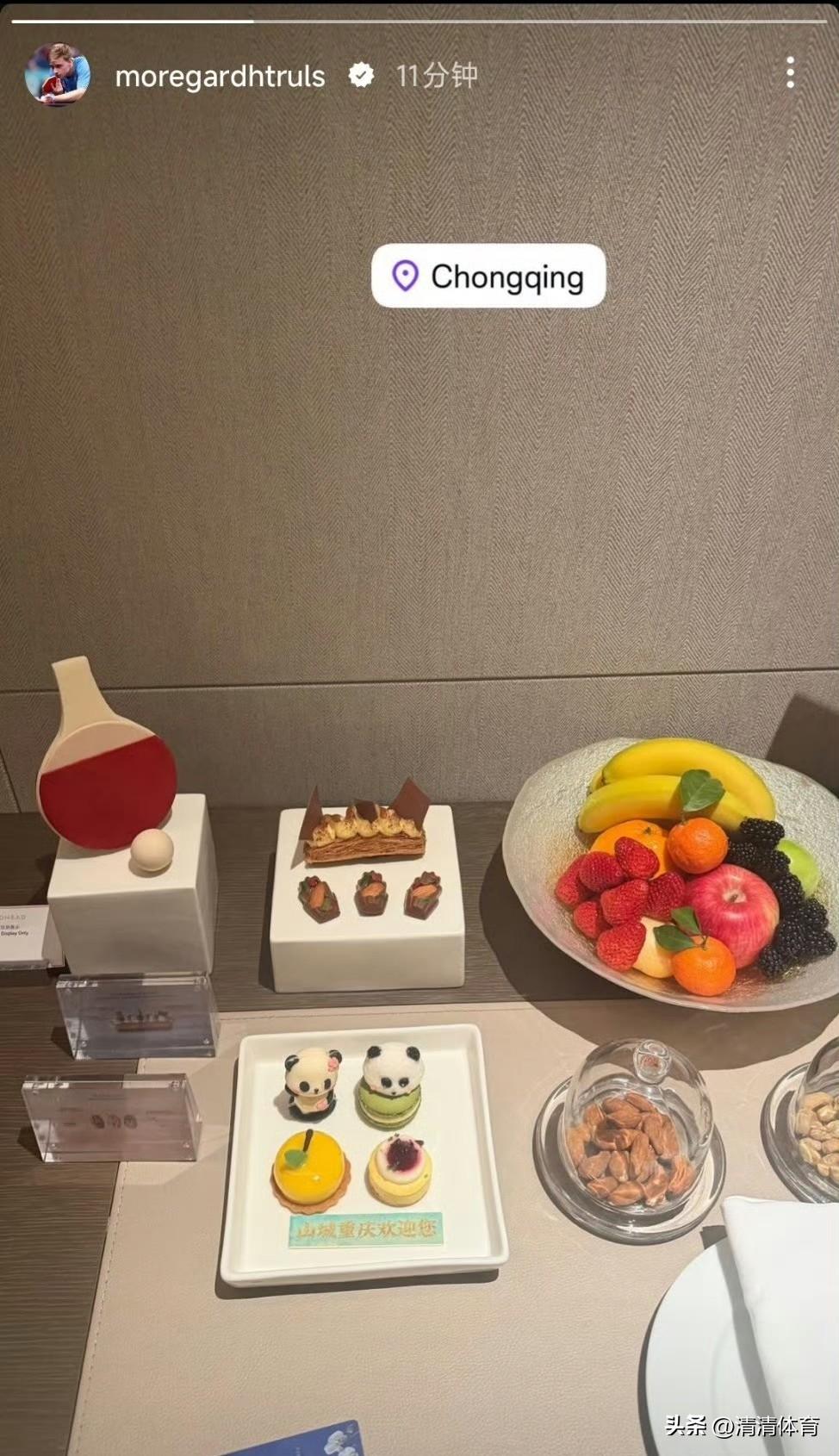 小莫已到重庆!酒店欢迎礼细节拉满, 熊猫甜点+乒乓巧克力, 这波山城欢迎仪式,谁看了不心动? 坐等他在重庆赛场与国乒大战三百回合😀