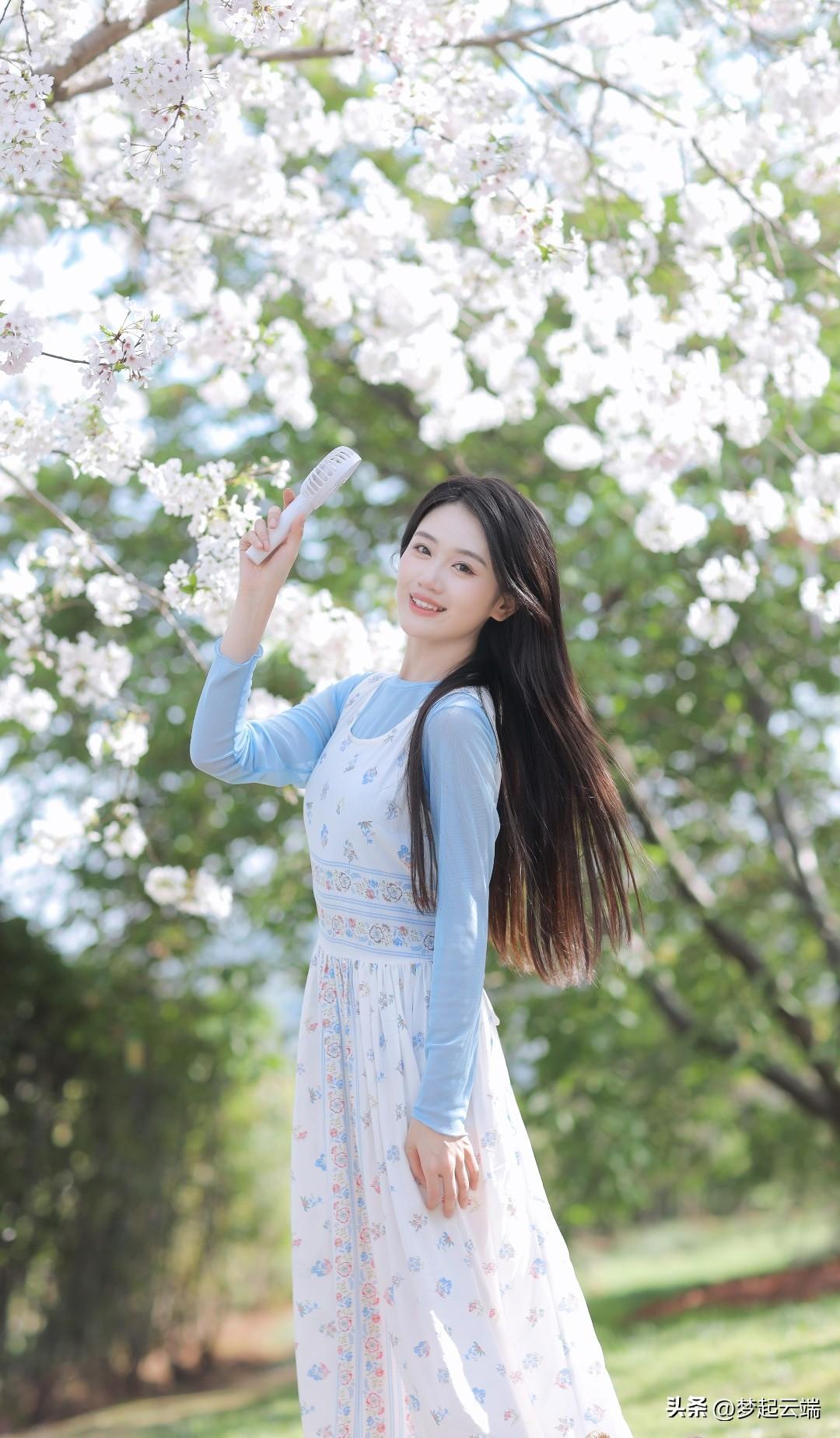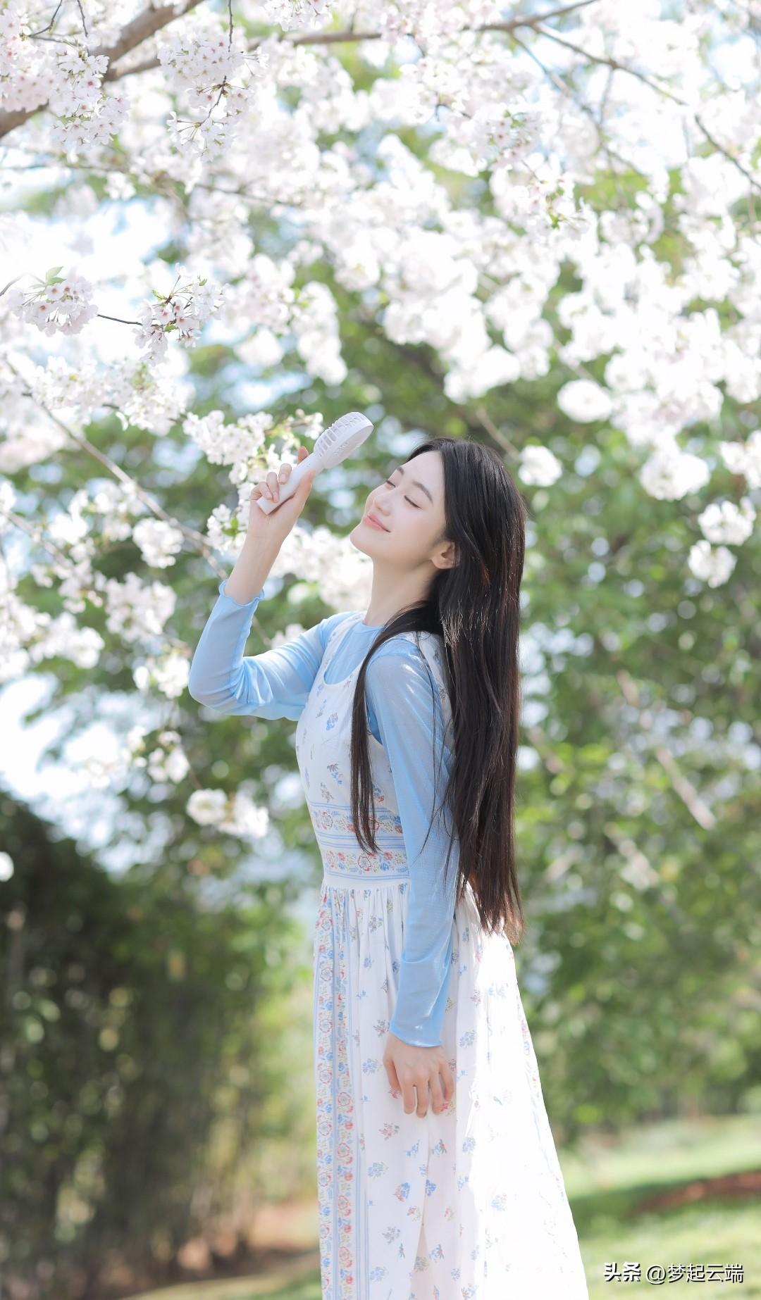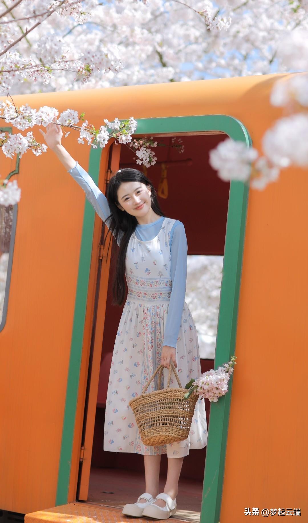 樱花树下,甜美少女,粉色花裙,春日浪漫。