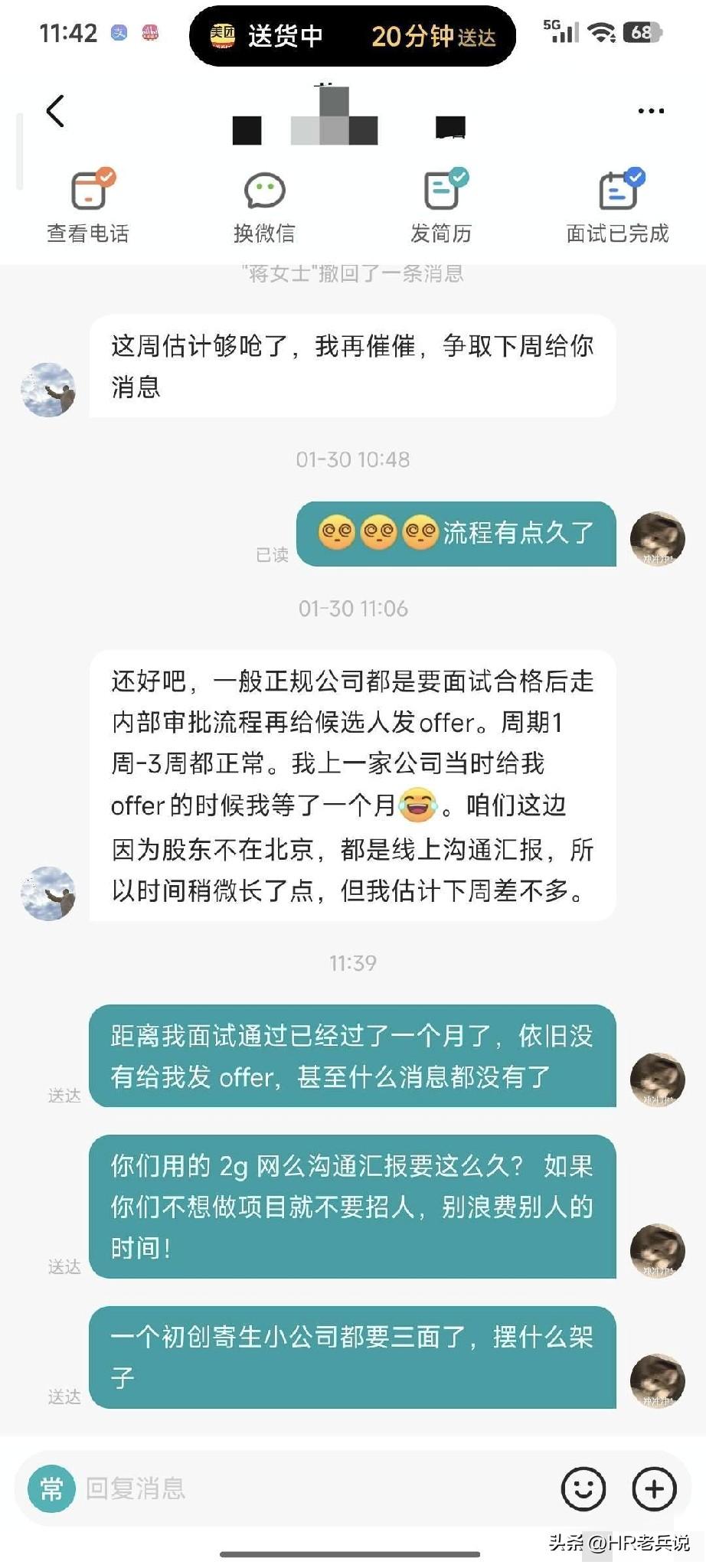 三轮面试后告知面试通过,结果等了一个月也没有等到offer,被候选人直言“一个初创寄生小公司摆什么架子,不想招人就别浪费别人时间...[笑哭] 话说作为一个hr,候选人的气愤完全能理解,但是候选人的这个做法我真不建议:面试结束后,不管面试官或者hr跟你说什么,只要offer一天没下来,你就马不停蹄的继续面别家,更没有必要去主动问什么进度了... 因为如果公司真招人,或者你方方面面性价比都特别高,公司那边自然会追着你。要说大公司流程确实慢,但是如果公司真招人,hr也会主动的和你保持足够频度的联系的。因为这关系到她的kpi; 如果她从没联系过你,你主动问她,她也只是冷淡的回复在走流程,让你耐心等等,那我以我的经验来说,这事十有八九最后也就不了了之了! 你如果不问,就当个有可能放那,你还有备胎被捞的可能;但你现在一怒之下,说人家“初创寄生小公司败家子,不招人还浪费你的时间”,这下来备胎被捞的可能都被你堵死了[笑哭]