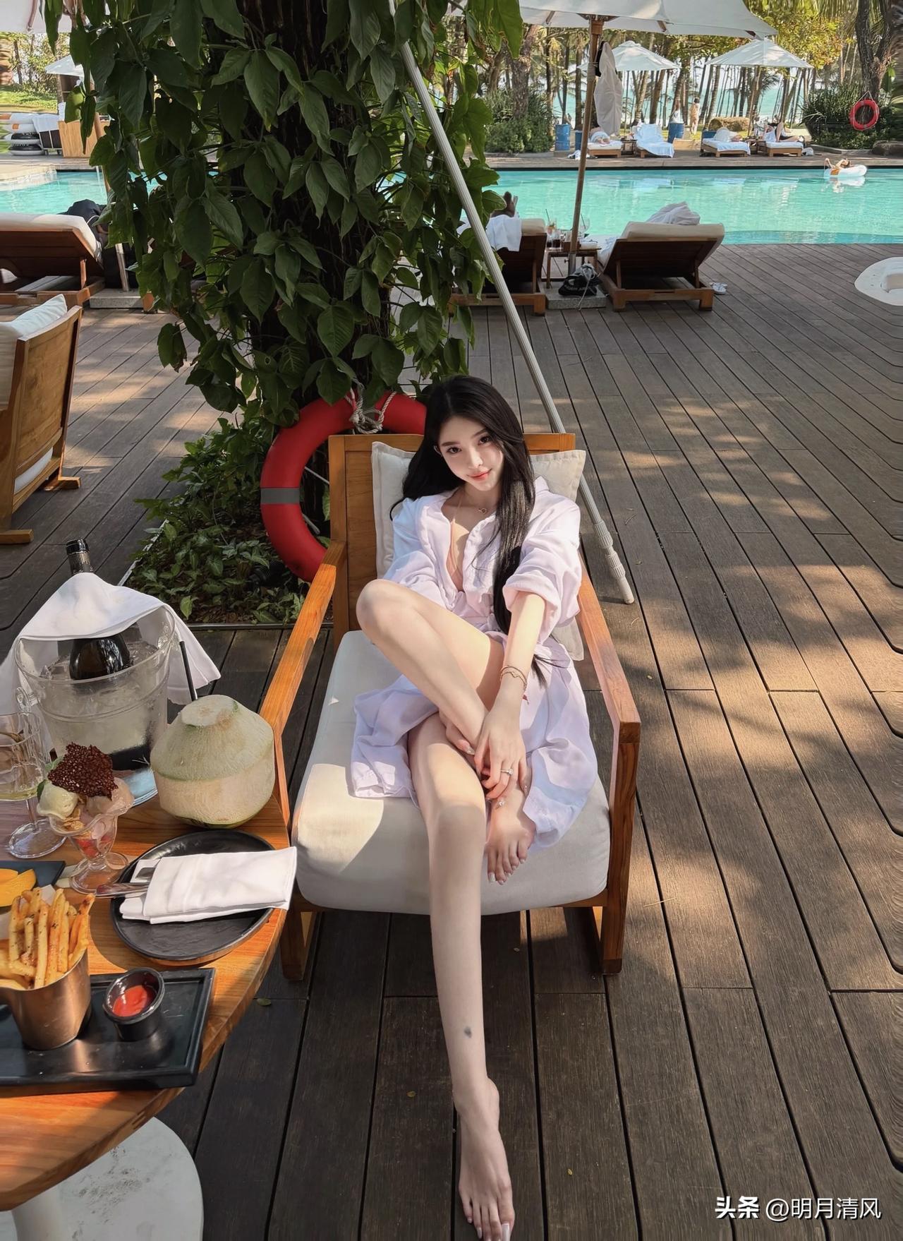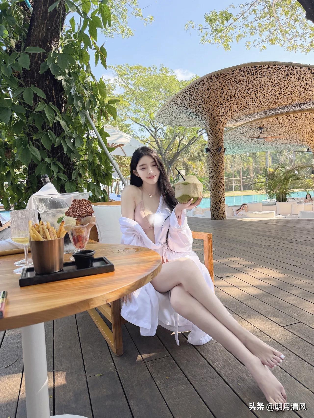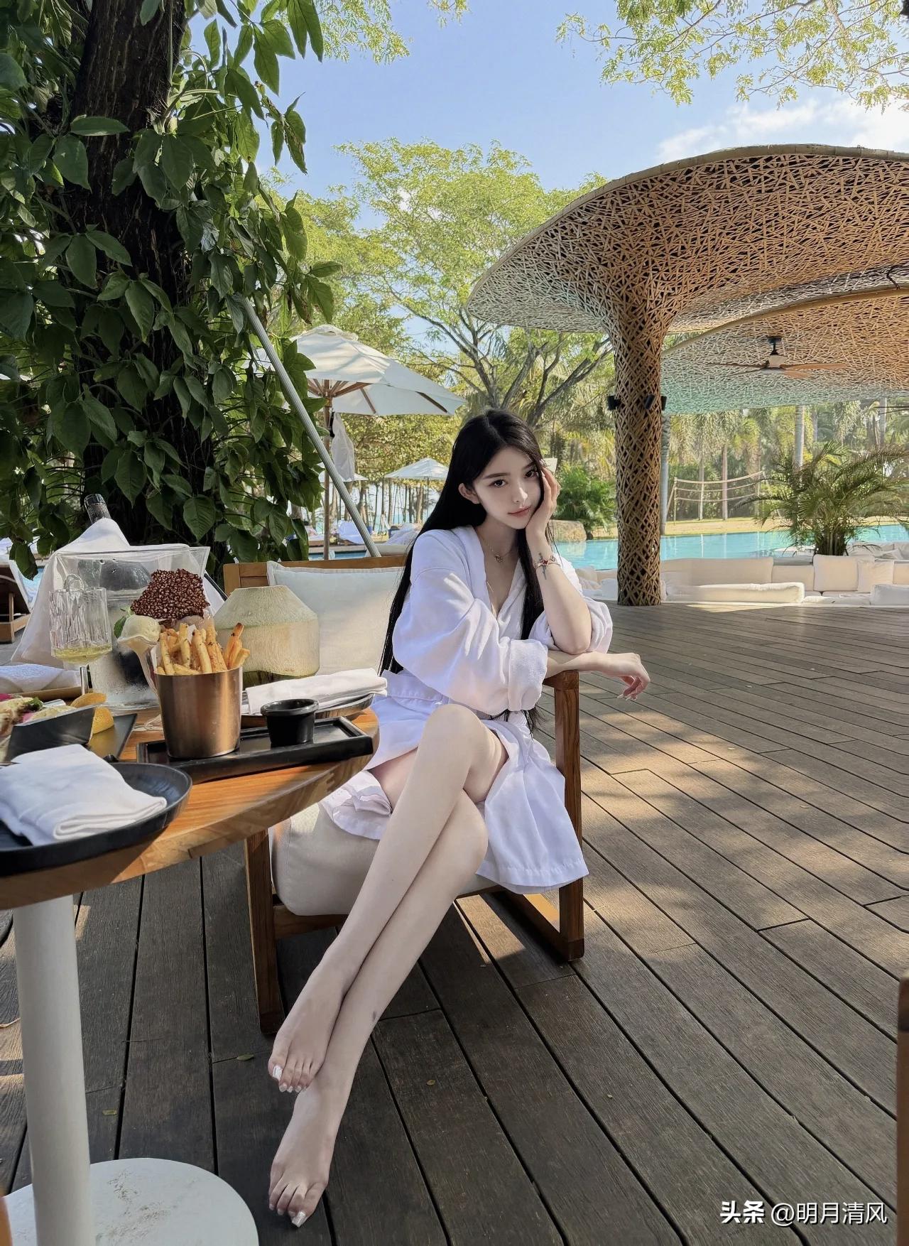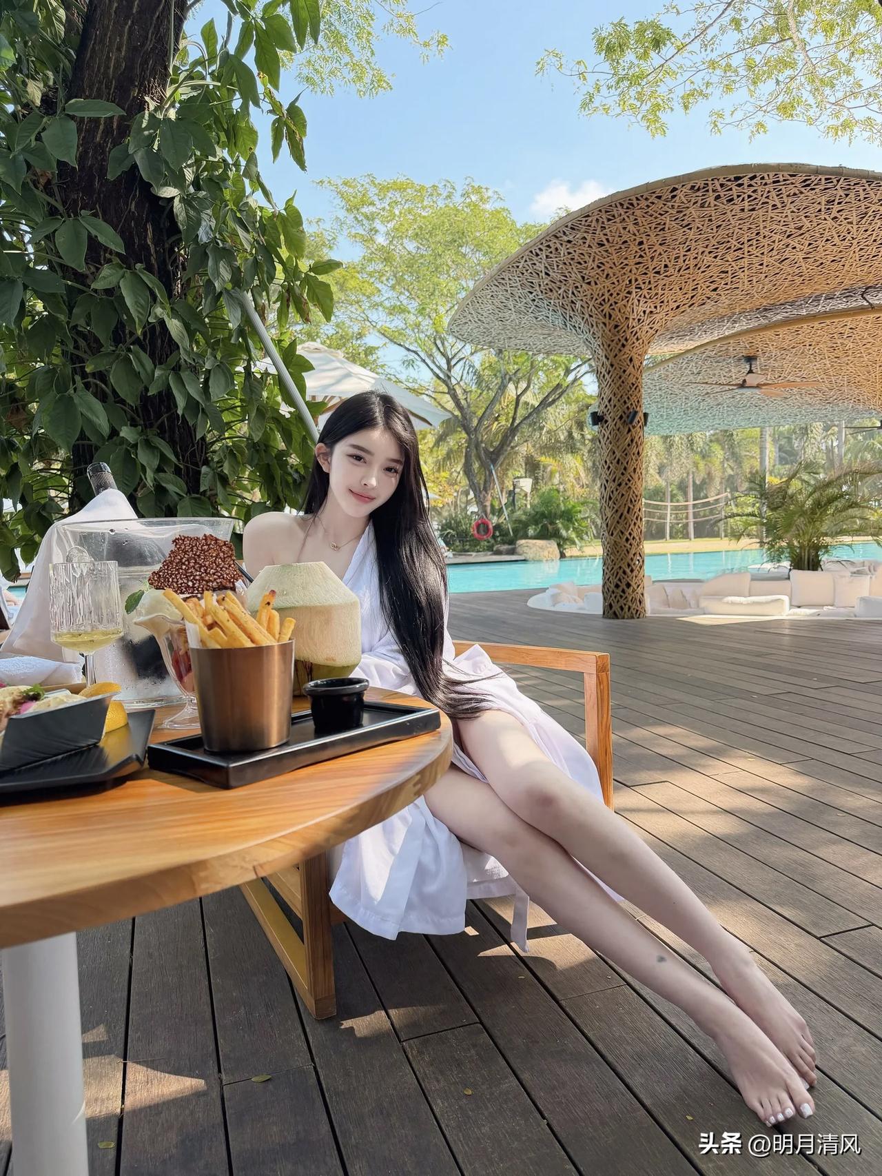 泳池边拍照,不用硬凹造型也能出片。 今天整理相册翻到一组客片,就在泳池边的木平台上,藤编顶棚、蓝色池水、树影斑驳,光线刚刚好。小姐姐穿了白色浴袍,里面搭浅色泳装,整体色调特别干净清爽。 分享一个很出效果的动作:侧坐在木椅上,双腿向前交叠伸出,身体微微前倾,低头看自己的手臂。这个姿势特别自然,有种不经意的松弛感,长发顺着肩前垂下来,光影落在腿上,氛围感直接拉满。 其他几个角度也顺手记录一下:靠椅侧坐歪头看镜头、正面端坐抱膝、托脸温柔注视、最后举起椰子轻松一笑。每一张都保留了餐桌上的薯条甜品、远处的泳池和藤编顶棚,度假感很足。 你们觉得泳池边拍照,最怕什么?是光线太硬,还是手不知道往哪放? 时尚穿搭