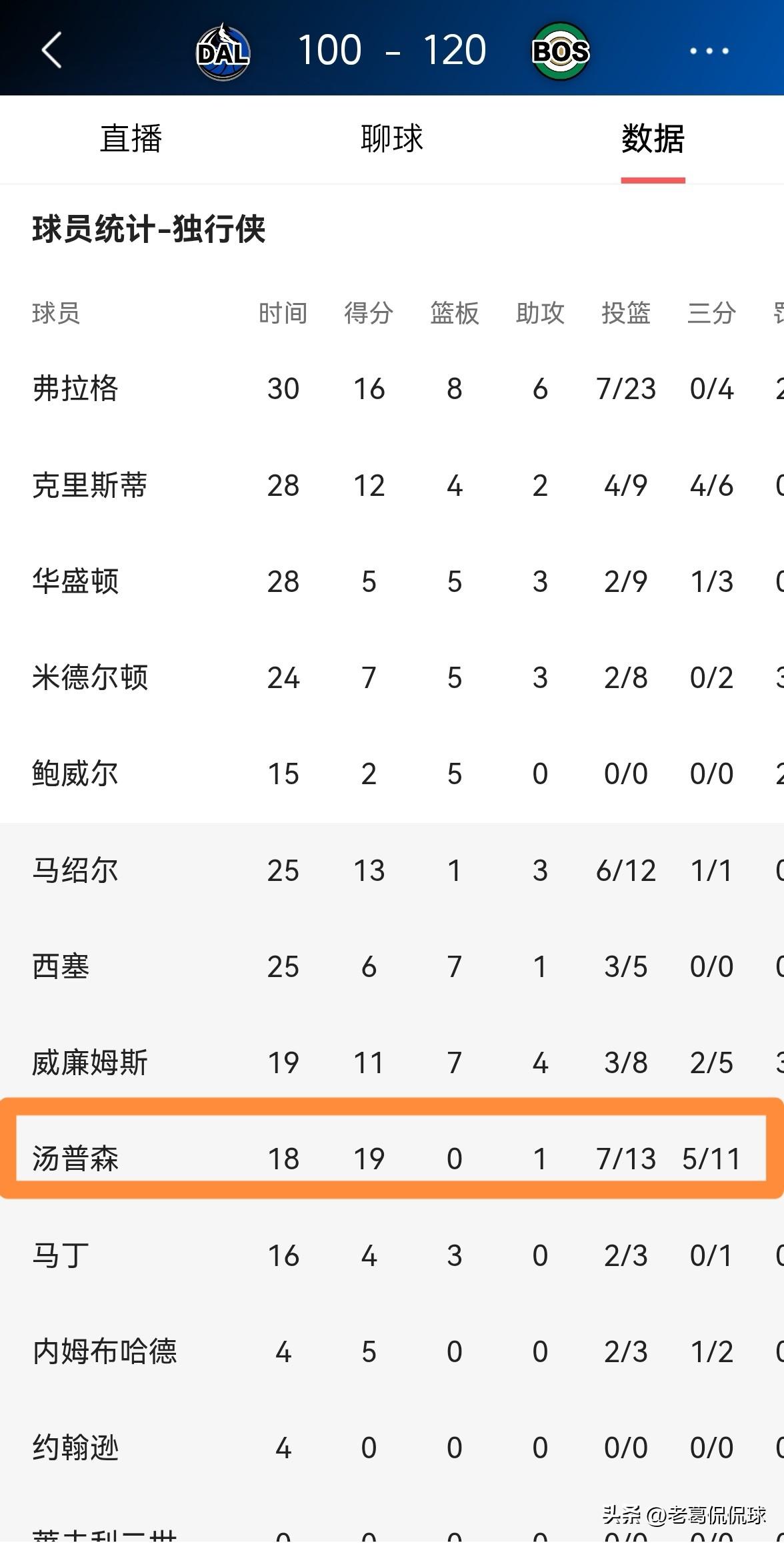 独行侠神射手汤普森真是让人欣喜若狂!虽然今天独行侠在客场以100:120惨败于凯尔特人,但是汤普森却打出了久违的高光表现。 全场比赛下来,汤普森替补出战18分钟,投篮13中7,其中三分球11中5砍下19分,还有1助攻,没有出现任何的失误和犯规,他的场上正负值为-8。 老实说,当我看到汤普森再次打出如此精彩的表现时,我真是欣喜若狂,我真的好久没有看到佛祖显灵了。
