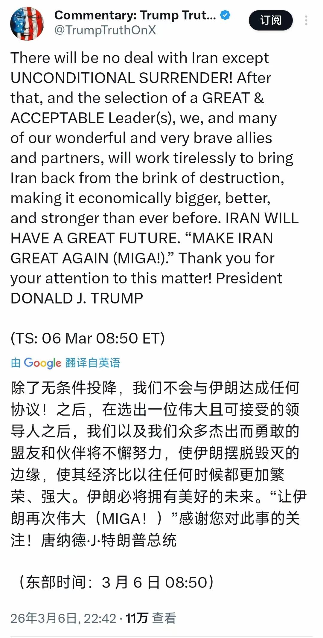 特郎普居然要求一个主权国家伊朗无条件投降。其霸道霸权心态爆露无遗。伊朗就不投降,必须跟美国死磕到底,看你特郎普能怎么样?有本事你特郎普直接派出地面部队去灭了伊朗?那美国霸权恐怕就彻底崩塌了。