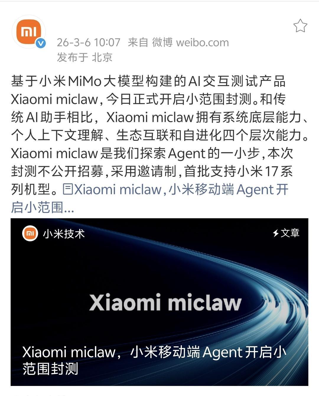 小米 miclaw来了!据说这个miclaw很强大,我先冲了家人们。