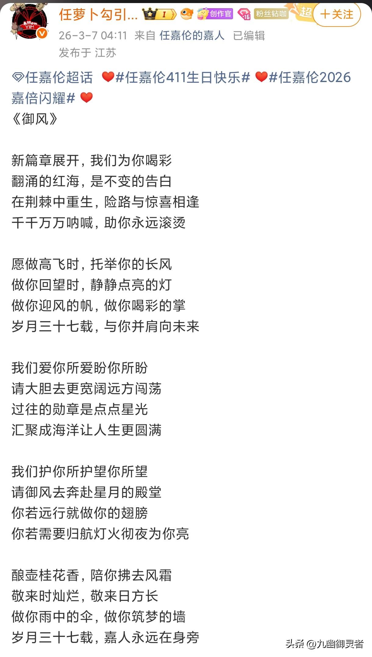 任嘉伦的37岁生日即将到来[蛋糕][蛋糕][蛋糕] 有粉丝给任嘉伦创作了一首生贺歌《御风》[赞][赞][赞] 字字句句都是对嘉伦最真挚的爱意 他一路披荆斩棘 活成了最耀眼的光[太阳][太阳][太阳] 而我就是最坚定的追光者 我会永远追随任嘉伦 一辈子跟着他的脚步[加油][加油][加油] 用心陪伴,默默支持 不负热爱,不负相遇 愿他乘风而上,星途璀璨,光芒万丈 永远是我们心中最耀眼的王👑👑👑 提前祝嘉伦生日快乐 未来一路生花[玫瑰][玫瑰][玫瑰] 嘉伦勇敢飞,嘉人永相随[心][心][心] 任嘉伦 任嘉伦最新动态