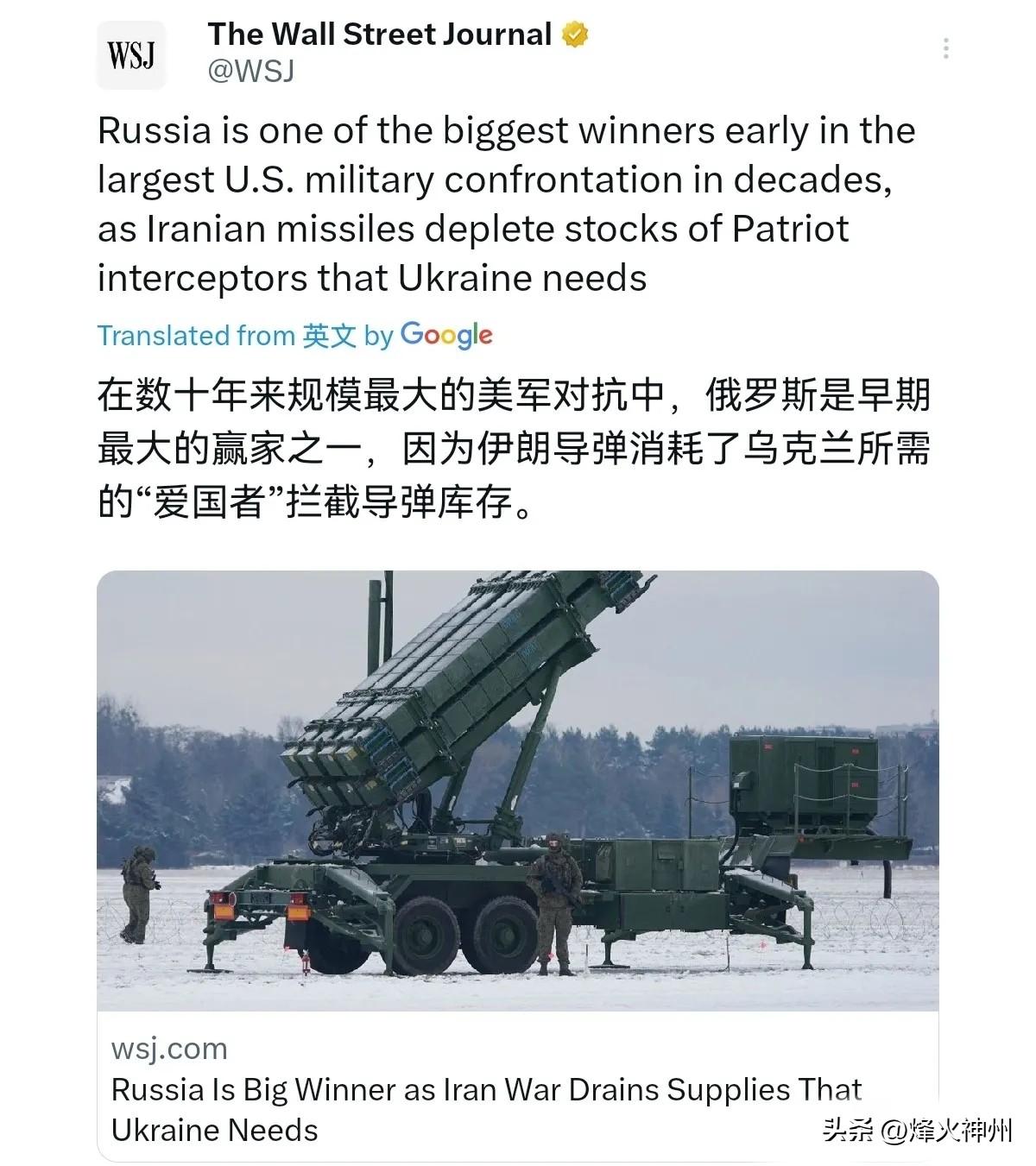 3月7日,美国华尔街日报刊文表示,在几十年来美国最大规模的军事对抗中,中国并非是最大的赢家,而这一次最大的赢家是俄罗斯。美媒表示,因为伊朗的导弹耗尽了乌克兰所需的爱国者拦截器库存。事实上,早在伊朗战争爆发之前,美国制造的“爱国者”导弹系统就遇到了生产瓶颈。 评几句: 《华尔街日报》坦言,中东对抗让俄罗斯成最大赢家,这番自曝家丑,狠狠戳穿美国全球战略的荒唐。伊朗一轮打击便耗尽美国“爱国者”拦截弹库存,本应支援乌克兰的装备被中东战场吞噬,乌克兰防空缺口持续扩大,俄罗斯战场压力大减。 美国军工复合体长期产能拉胯,拦截弹生产远跟不上消耗速度,政府只会四处煽风点火,却无力填补军备窟窿。一边是俄乌冲突泥潭未脱,一边是中东战火重燃,美国两线作战、四处漏风,战略资源被无情撕裂。 高油价为俄罗斯经济输血,地缘格局全面被动转向,美国搬起石头砸自己的脚。这场霸权表演,看似威风凛凛,实则顾此失彼。美国亲手制造困局,让对手坐收渔利,所谓全球领导力,早已沦为笑柄。