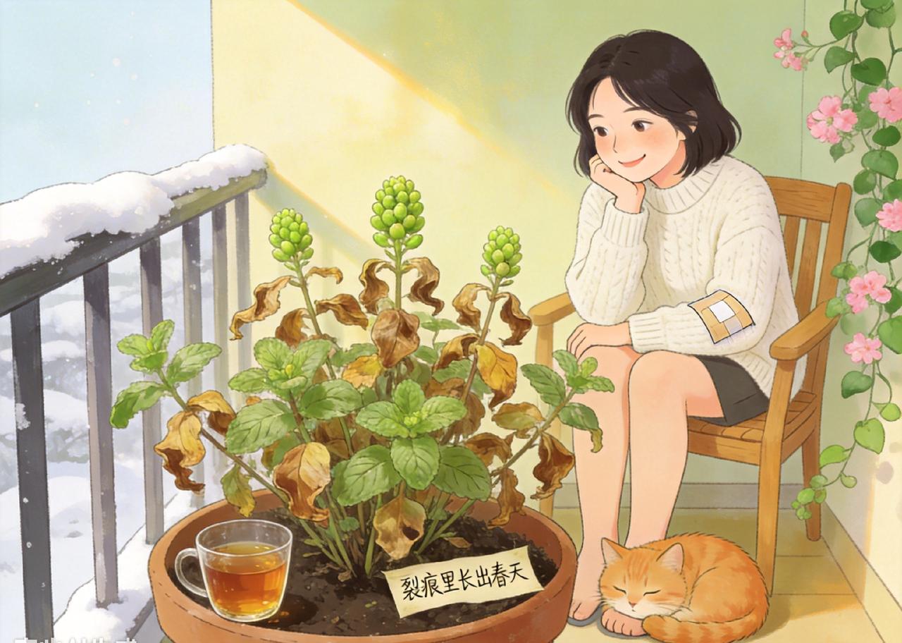 以前总觉得,日子得过得像烟花一样才算没白活,盯着远处的山峰,反而忽略了脚下的泥泞。直到那年失业,整日窝在阳台看那盆快枯死的薄荷,才突然悟出一个道理:人生最掉价的活法,就是哪怕在寒冬里,也要强行伪装成盛夏。 我们太容易被“成功”的模板裹挟,忙着赶路,忙着合群,却忘了听自己心里的声音。其实,真正的成长不是变得无坚不摧,而是学会坦然接受自己的裂痕。就像那盆薄荷,我没再拼命浇水救它,只是剪去了枯枝,把它搬到了向阳处,没过几天,新绿竟真的冒了出来。 生活哪有那么多惊天动地的大事?不过是把心放宽,把事看淡。别总想着一定要活成谁眼里的光,在低谷时能把自己哄好,在平淡里能发现微小的快乐,这才是成年人最顶级的自律。记住,允许自己脆弱,才是一种更高级的坚强。