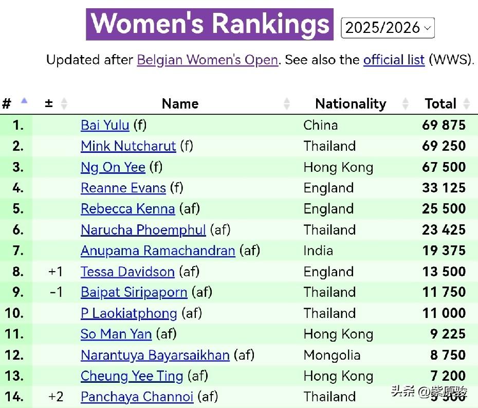 再说一下白雨露保级。白雨露目前女子世界排名第一,但积分只比排名第二的闵克·旺哈鲁泰多625分。要知道,旺哈鲁泰本赛季也需要保级,因此肯定要竭尽全力争取回到第一。 目前,女子斯诺克排名赛还剩两站,一站是3月27-29日的英国女子公开赛。上上赛季,白雨露没有参加此项赛事,按照规则,不需要扣积分,而旺哈鲁泰决赛输给吴安仪,获得了亚军,届时要扣一点积分。 本赛季最后一站女子排名赛就是女子世锦赛,这站赛事的冠军可以直接拿到职业资格,同时也可以增加积分。 对白雨露来说,最好的结果是保住世界第一,同时拿到世锦赛冠军,这样保住职业资格就有双重保险。 最不好的结果是,排名第一没保住,世锦赛也没有拿到冠军,职业资格就悬了。当然按照白雨露的实力,出现这种情况比较极端,但也不是不可能。 因此,3月26日开始的英国女子公开赛,白雨露一定要全力以赴,争取在积分上拉开与旺哈鲁泰的差距,保住世界第一的位置。2月初的比利时女子公开赛,白雨露半决赛3-4输给了旺哈鲁泰,就让人有点担心。 从现实情况看,保住排名第一比拿世锦赛冠军的难度小一点。要获得世锦赛(白雨露是上届冠军),容错空间太小,难度更大。去年白雨露决赛6-4胜旺哈鲁泰,但赢得并不轻松。 目前在世界斯诺克巡回赛征战的职业女选手有4人,本赛季是旺哈鲁泰、白雨露的保级赛季,吴安仪、瑞安·埃文斯下个赛季才保级。