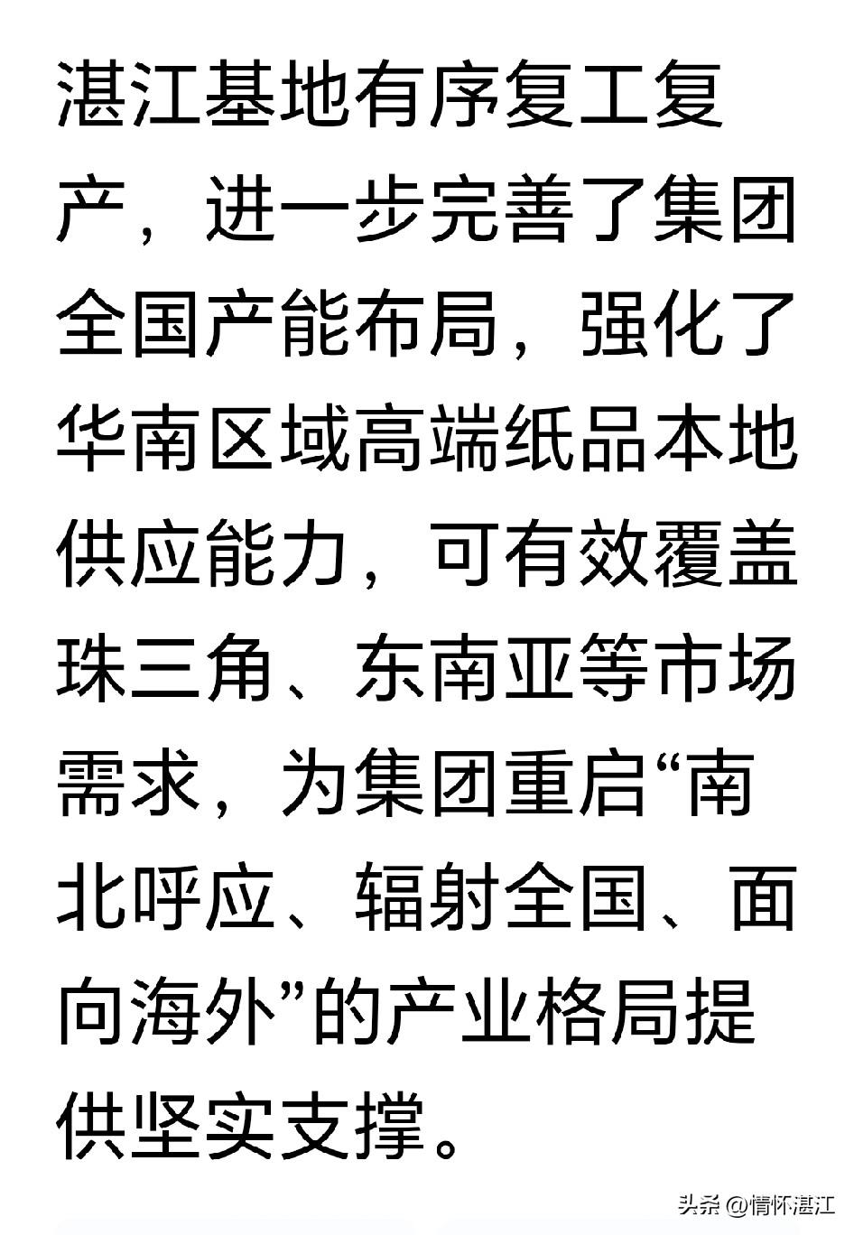 据报道,晨鸣集团湛江生产基地复工了!这对湛江经济确实是一个很好的消息! 晨鸣纸业是国内造纸行业中具有重要影响的企业,虽然一度陷入困境,但是希望晨鸣集团走出困境发展越来越好,湛江基地复工为湛江经济发展创造有利条件,为湛江市贡献税收和增加就业。