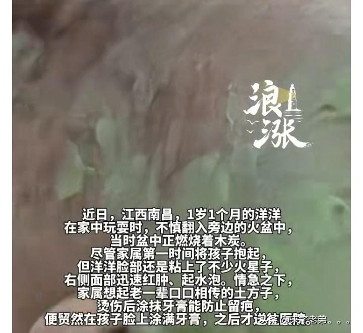 牙膏不是万能的千万别乱用了,近日,江西南昌,1岁1个月的洋洋不慎翻入旁边的火盆中,脸部被烧伤。家属的第一反应不是送孩子去医院,竟然用起了土方子贸然在孩子脸上涂满了牙膏后送医。 由于牙膏已牢牢粘附在创面上,医护人员不得不用生理盐水反复冲洗擦拭,一点点将残留的牙膏彻底清理干净,真正的创面情况才清晰显现。 医生提醒:在创面上涂抹牙膏,反而可能造成二次感染,不可行。 切记不要盲目信任偏方,孩子的烫伤面积太大,受罪了。 正确儿童烧伤急救:记住5字口诀 “冲、脱、泡、盖、送” 1. 冲:立即用流动的凉水冲洗15~30分钟 - 用常温自来水,不是冰水、冰块 - 直接冲在烧伤部位,快速降低皮肤温度,阻止热量继续损伤深层组织 2. 脱:边冲边轻柔脱掉衣物 - 若衣服粘在皮肤上,不要硬撕,用剪刀剪开周围未粘连部分 - 戒指、手镯、鞋袜及时取下,防止肿胀后勒住肢体 3. 泡:冲洗后继续凉水浸泡10~20分钟 - 适用于中小面积烧伤,大面积烧伤不建议长时间浸泡,避免失温 4. 盖:用干净无菌纱布/清洁保鲜膜轻轻覆盖 - 目的是保护创面、防灰尘、防感染 - 不要用毛巾、棉花等易粘毛的东西 5. 送:立即送正规医院烧伤科
