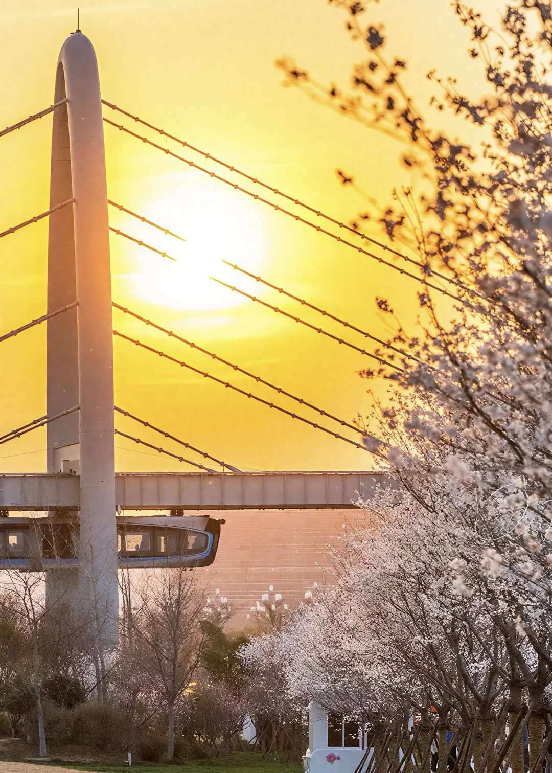 ✔️ 黄金时间:提前半小时蹲守落日,樱花+空轨同框