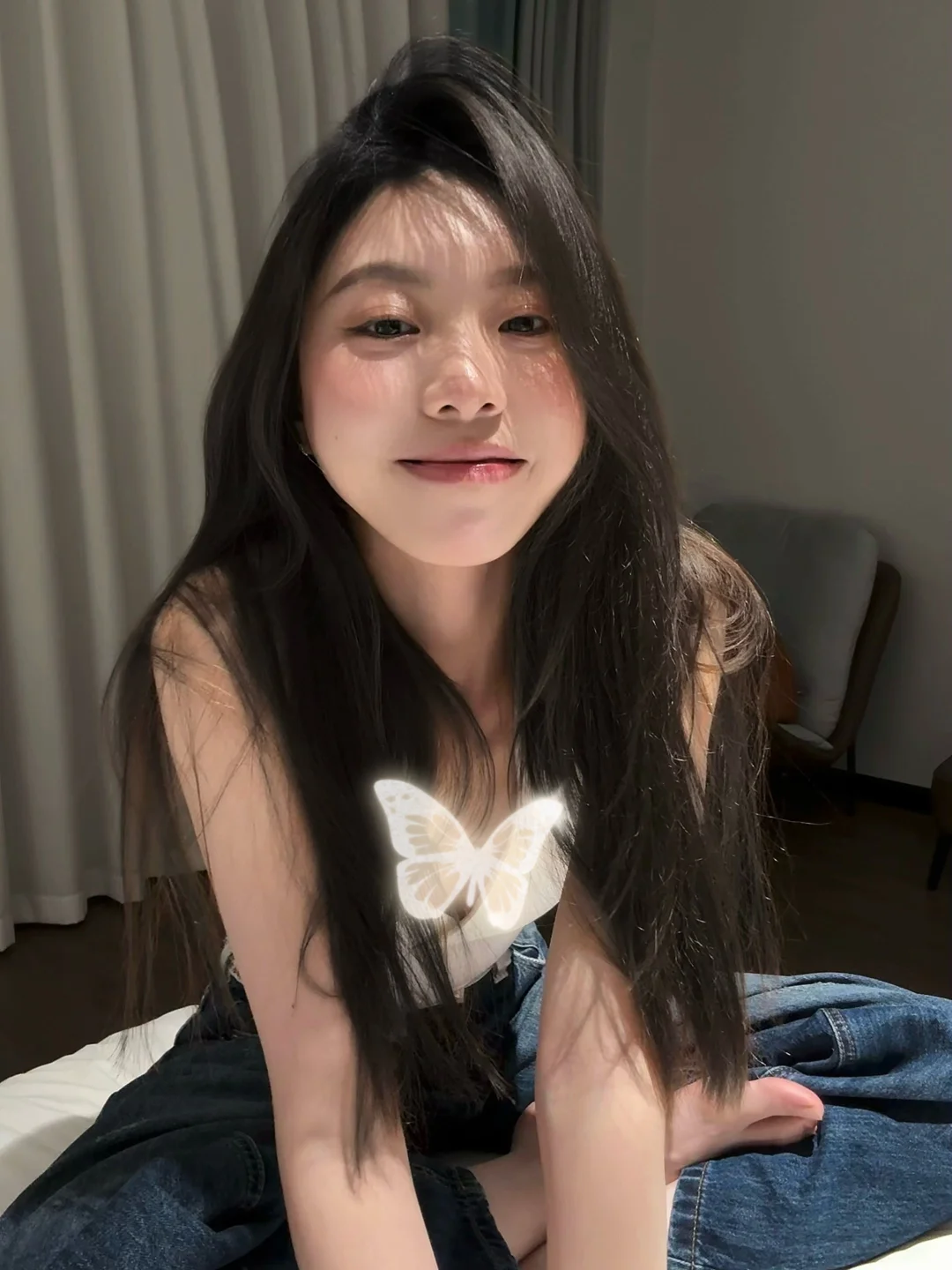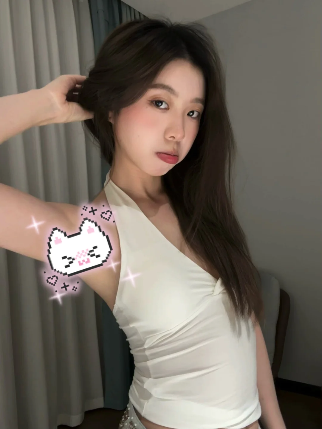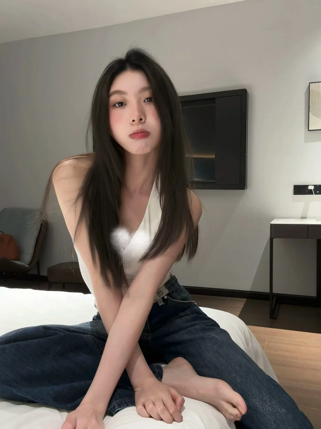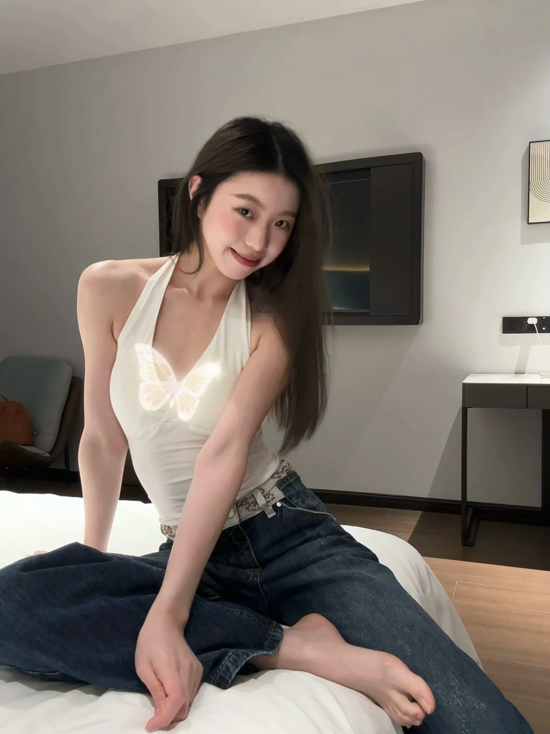 今日份松弛感已送达✨ 挂脖小上衣+阔腿牛仔裤,是舒服又出片的组合~
