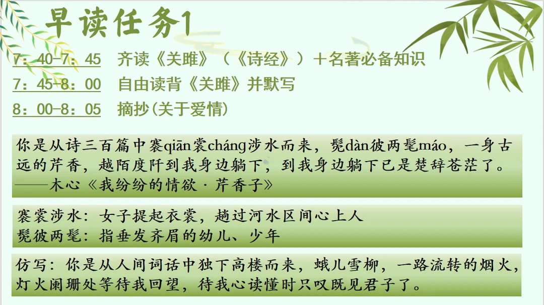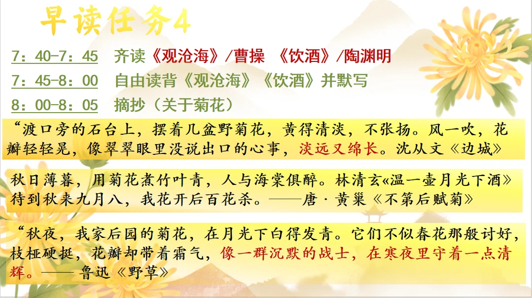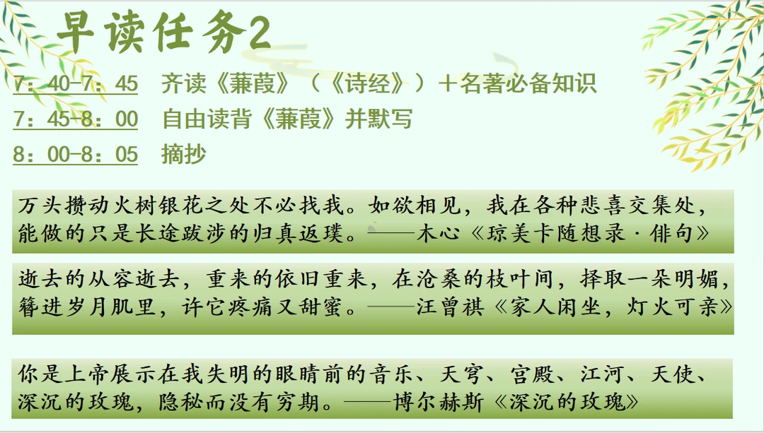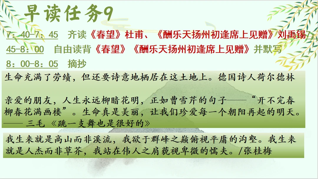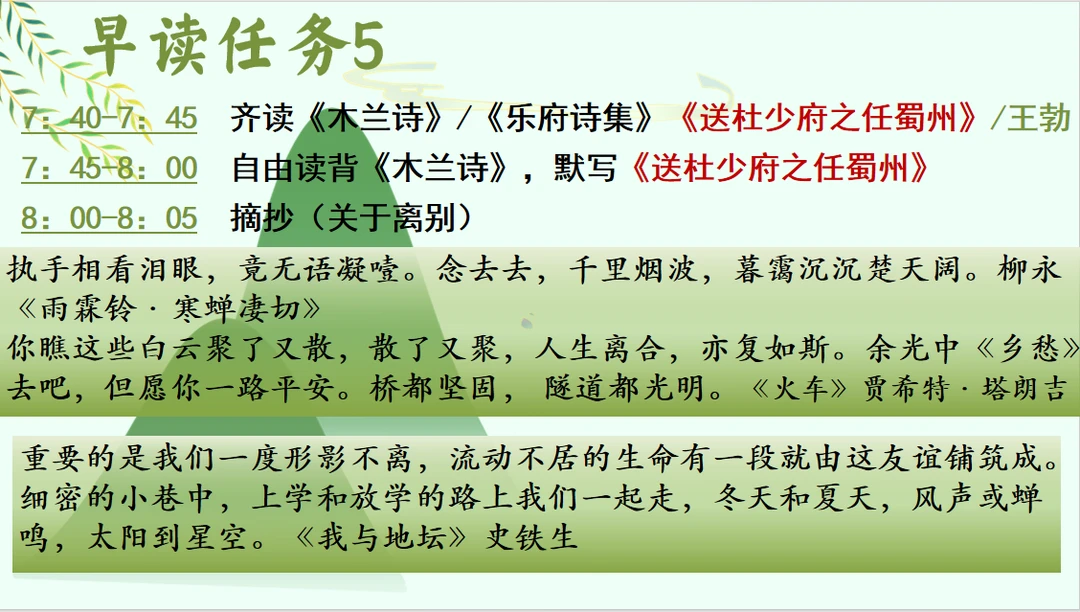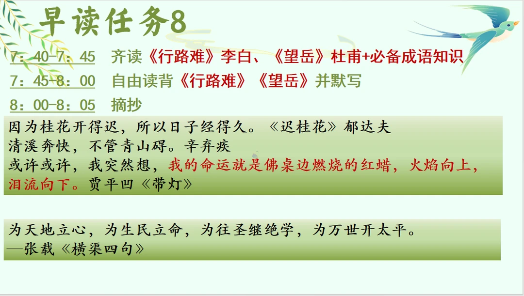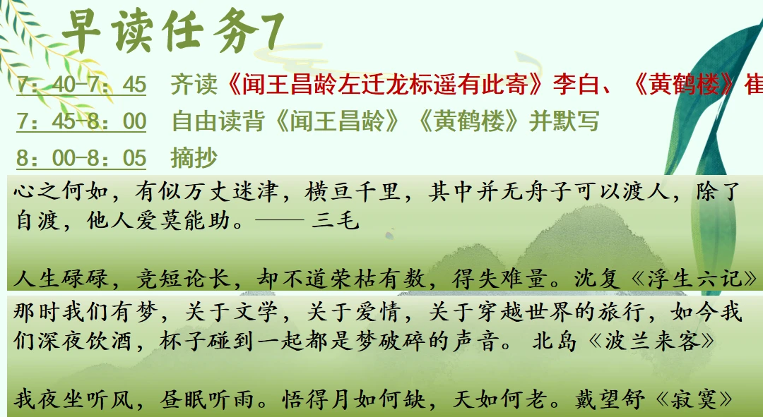 按照课课标要求60篇古诗文整理了一个早读课件(目前只做到了任务9)可以参考下思路。先必背古诗词后面整理文言文,基本一节早读默两首短诗或一首长诗,可以早读上课前就做好摘抄哦~