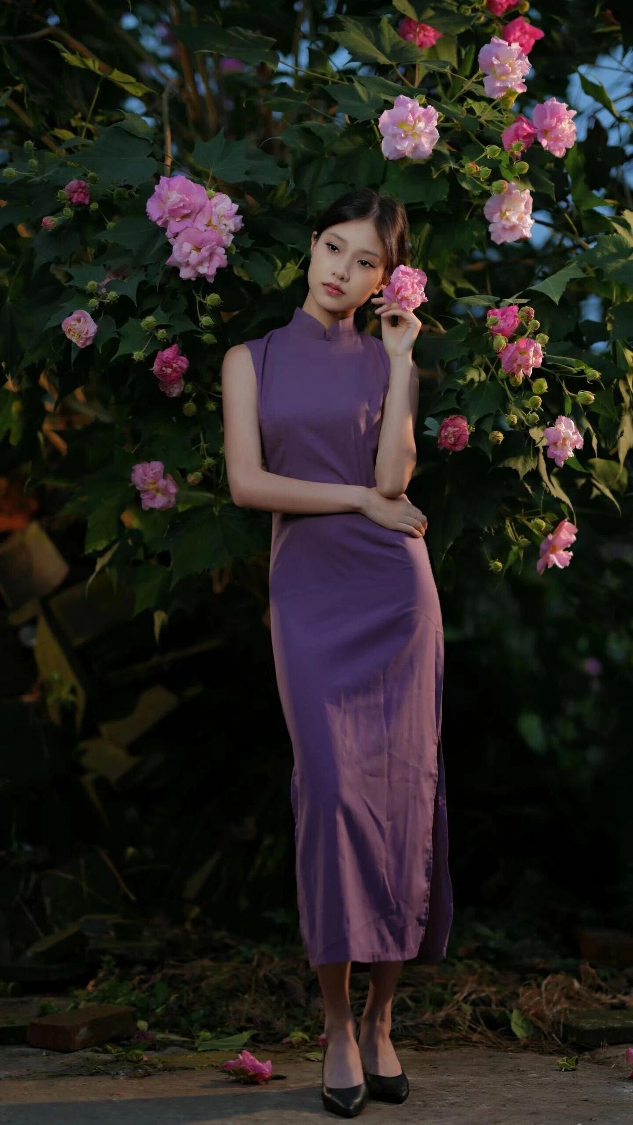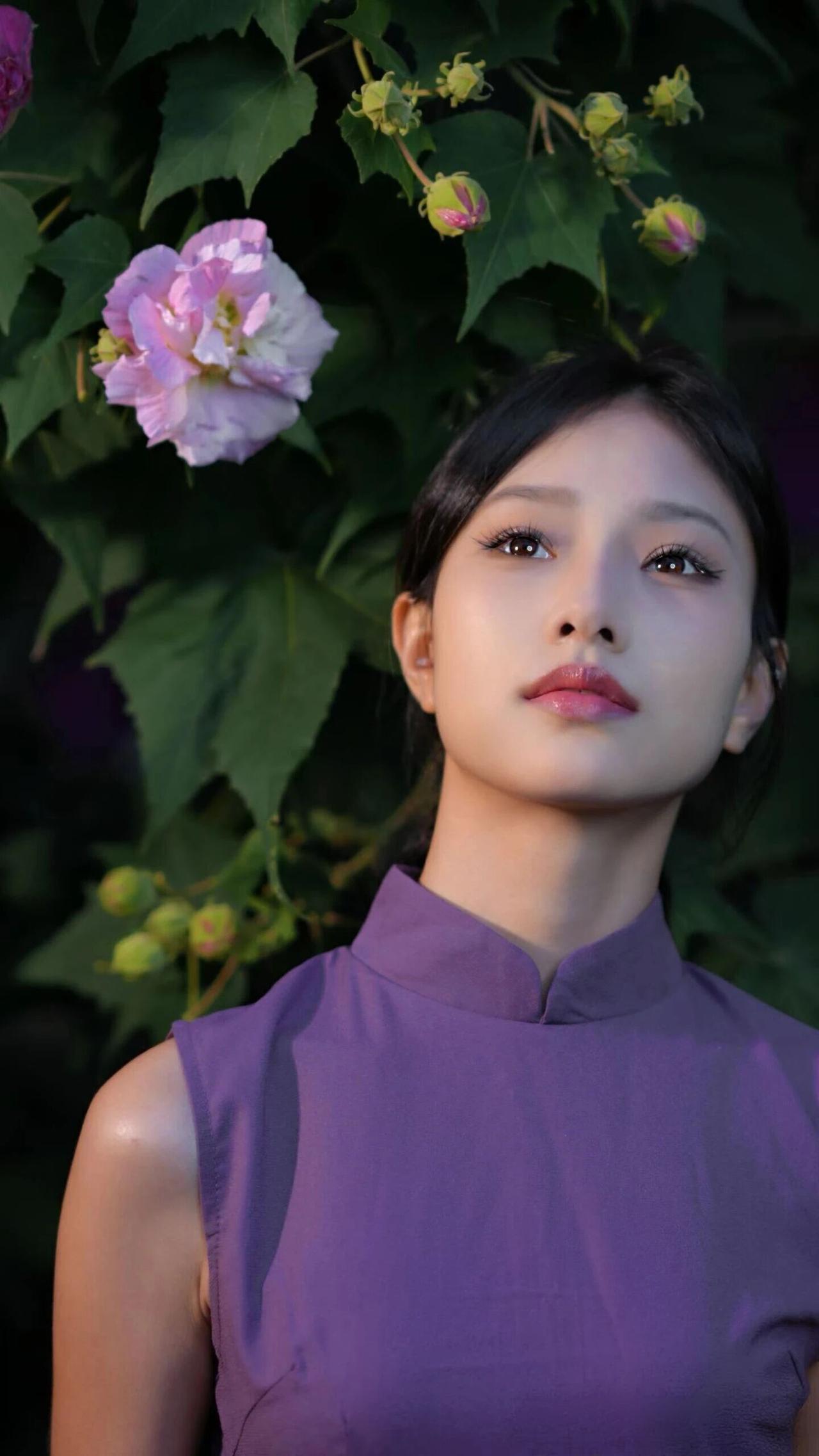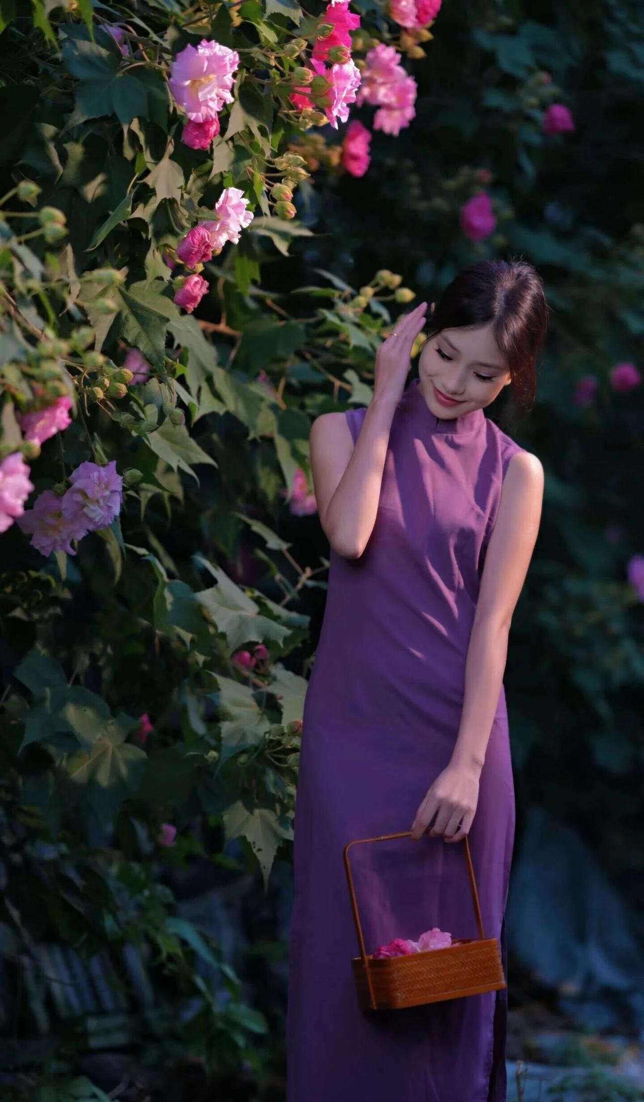 什么样的穿搭可以成为气质女神? 她伫立于盛放的芙蓉花丛间,宛如从古韵画卷中走出的佳人,将紫色旗袍的矜贵与花间的柔美融合得浑然天成。 身着一袭无袖紫色立领旗袍,纯粹的烟紫调自带清冷温婉的气韵,利落剪裁贴合身形,勾勒出窈窕纤细的身姿。立领衬得脖颈修长优美,无袖设计露出光洁细腻的肩臂,简约版型褪去繁复,尽显东方美学的含蓄与雅致。 乌发松松挽起,几缕碎发轻垂脸颊,眉眼清隽柔和,眼波流转间既有静谧的柔情,又藏着几分淡然的疏离。唇色淡雅,或轻执艳粉花枝贴近肩头,或手挽竹篮浅笑嫣然,或撑伞仰望光影,或捧书静立凝眸,每一个姿态都舒展自然。 暖柔的光线漫过身影,将紫裙的温润与芙蓉花的艳粉晕染出朦胧层次,花影婆娑间,她如一朵悄然绽于枝头的紫萼,清雅脱俗,自带一段不疾不徐的温婉韵致,美得含蓄又惊心动魄。