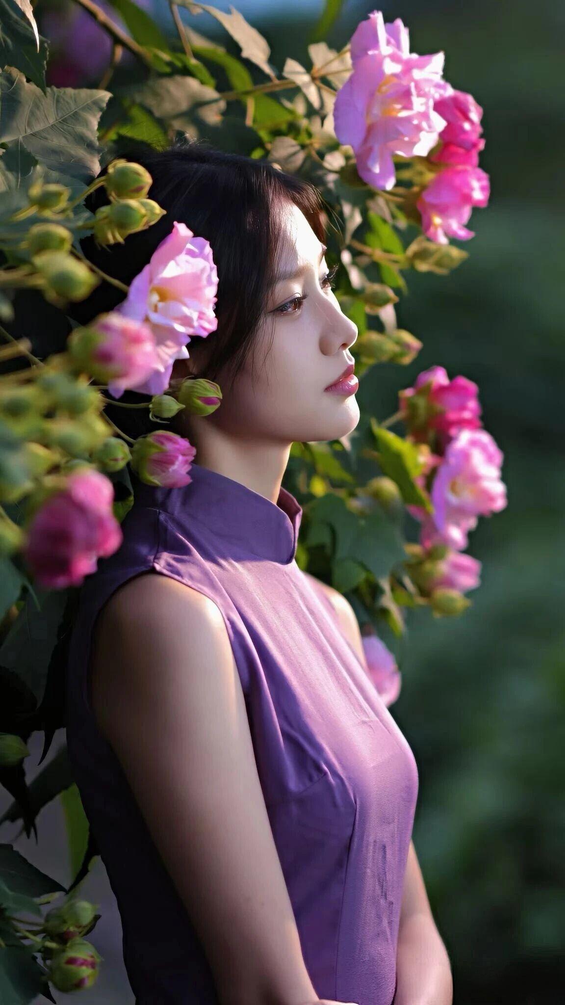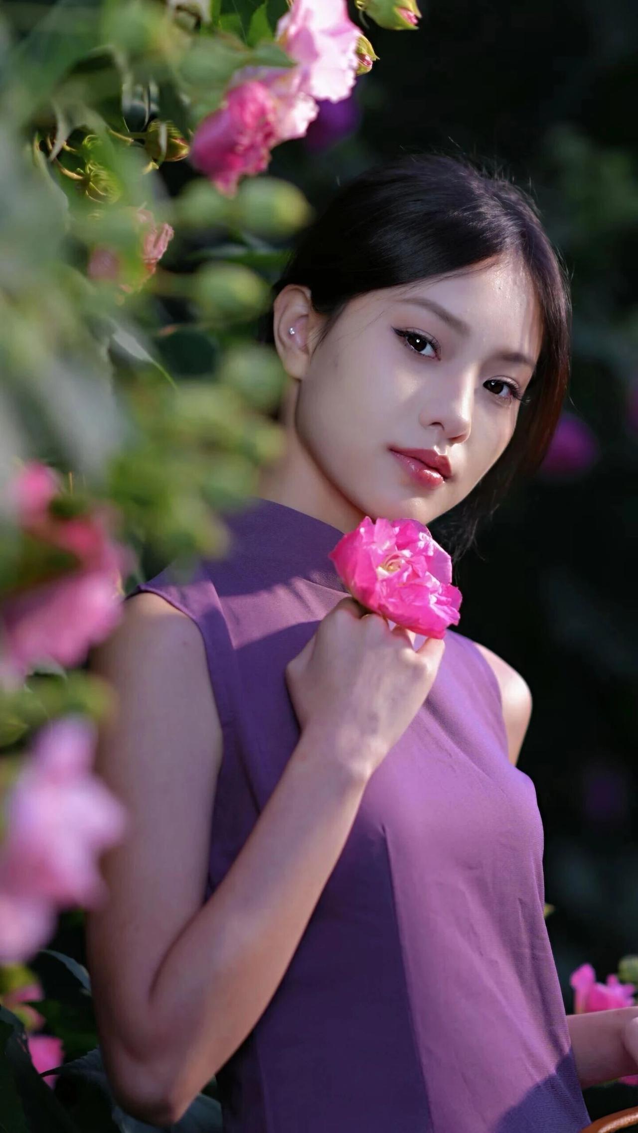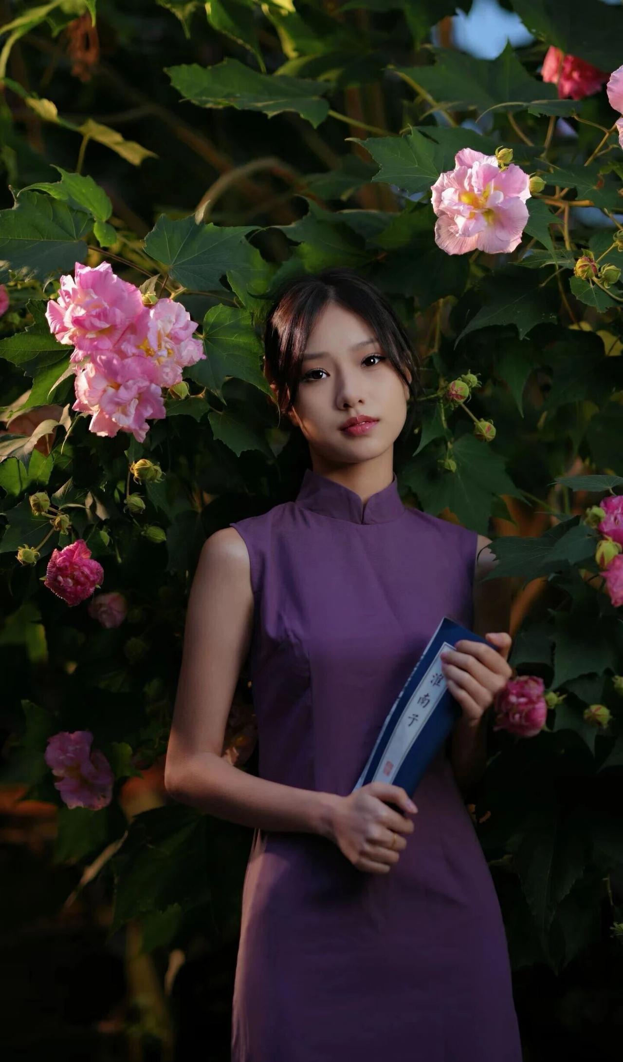 什么样的穿搭可以成为气质女神? 她伫立于盛放的芙蓉花丛间,宛如从古韵画卷中走出的佳人,将紫色旗袍的矜贵与花间的柔美融合得浑然天成。 身着一袭无袖紫色立领旗袍,纯粹的烟紫调自带清冷温婉的气韵,利落剪裁贴合身形,勾勒出窈窕纤细的身姿。立领衬得脖颈修长优美,无袖设计露出光洁细腻的肩臂,简约版型褪去繁复,尽显东方美学的含蓄与雅致。 乌发松松挽起,几缕碎发轻垂脸颊,眉眼清隽柔和,眼波流转间既有静谧的柔情,又藏着几分淡然的疏离。唇色淡雅,或轻执艳粉花枝贴近肩头,或手挽竹篮浅笑嫣然,或撑伞仰望光影,或捧书静立凝眸,每一个姿态都舒展自然。 暖柔的光线漫过身影,将紫裙的温润与芙蓉花的艳粉晕染出朦胧层次,花影婆娑间,她如一朵悄然绽于枝头的紫萼,清雅脱俗,自带一段不疾不徐的温婉韵致,美得含蓄又惊心动魄。