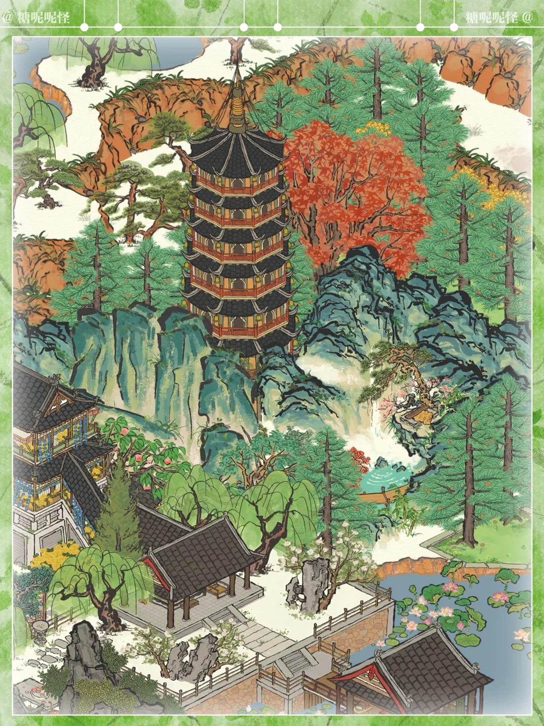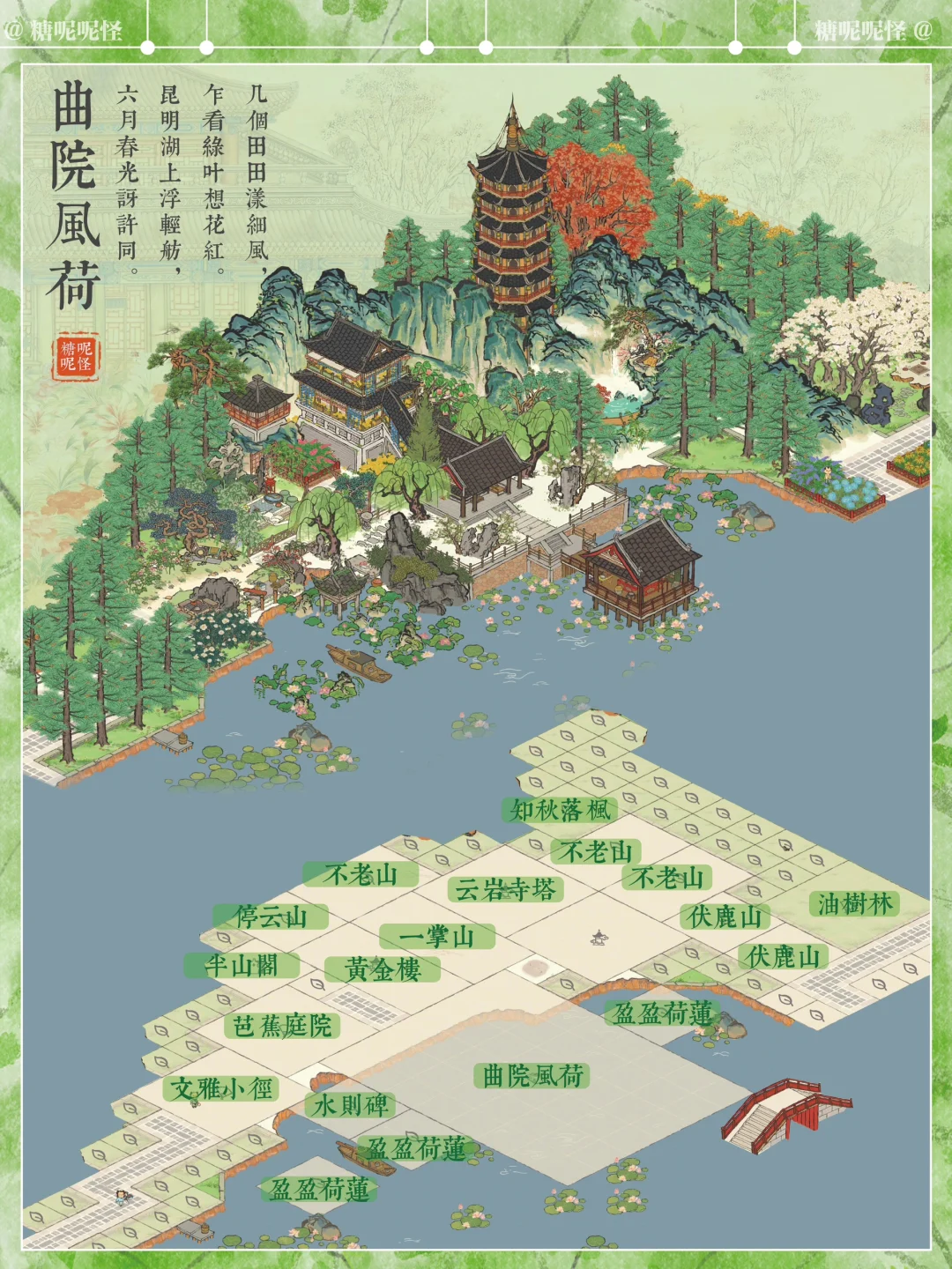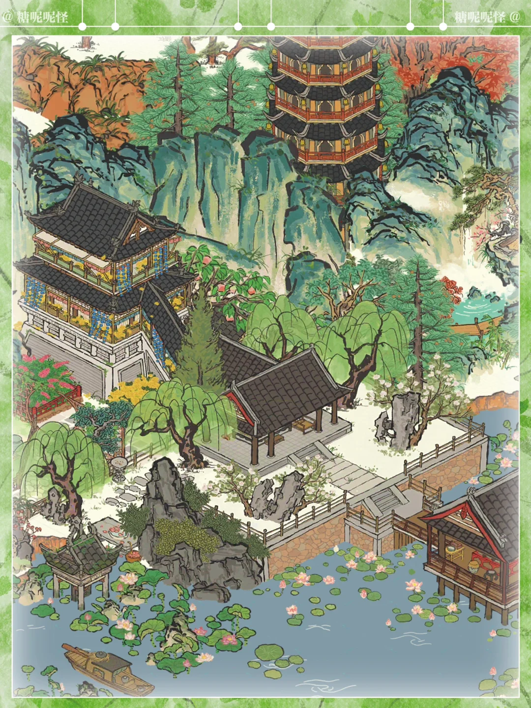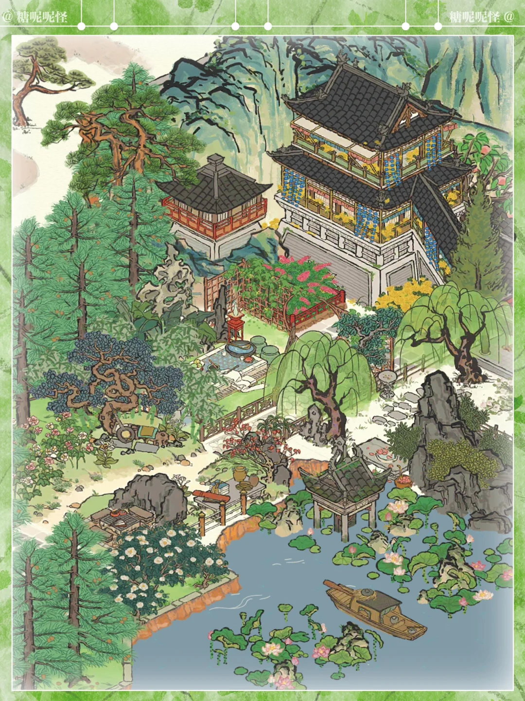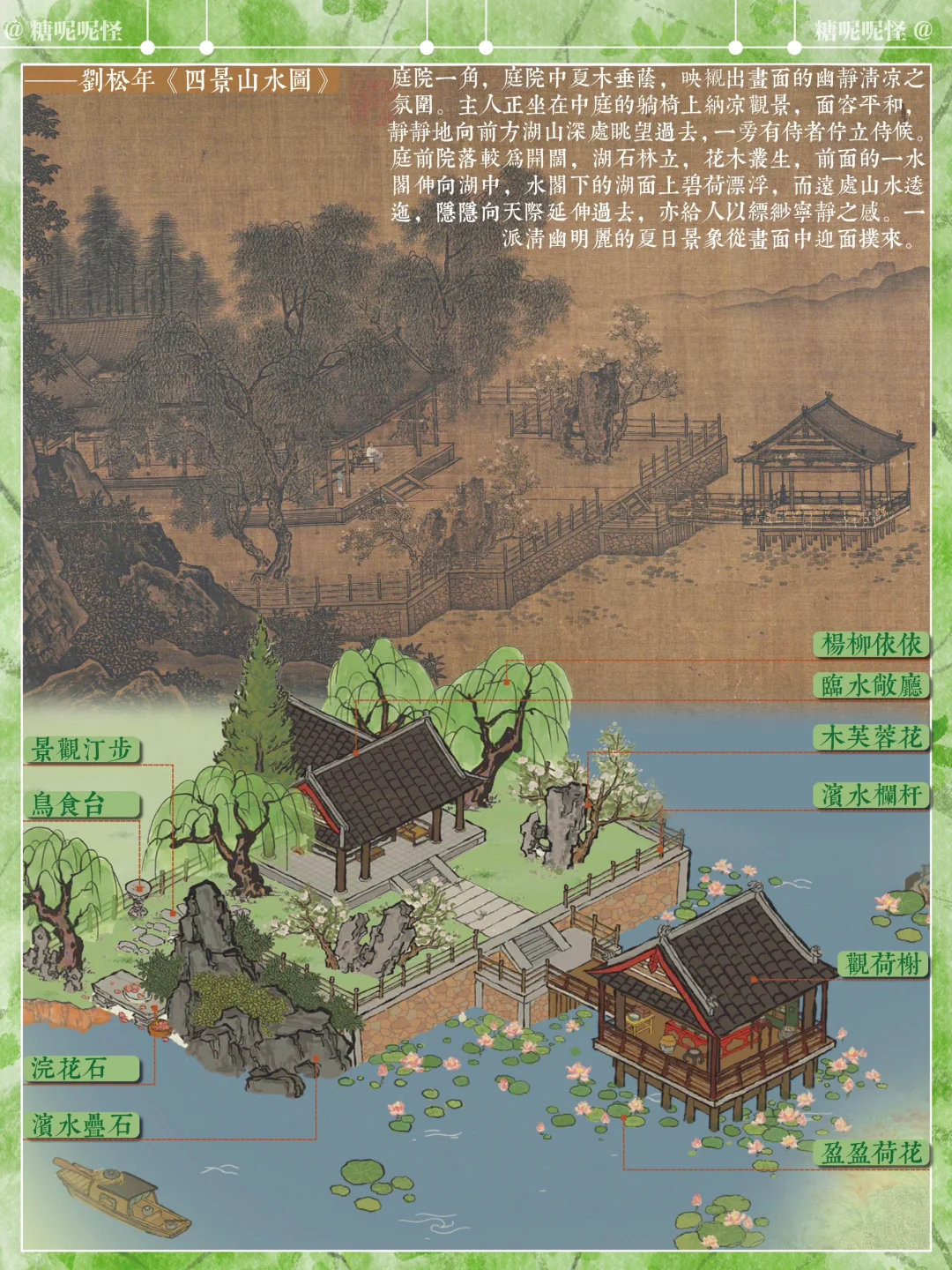 江南百景图建筑原型【第136】-【曲院风荷】 原型是刘松年的《四景山水图》其二:庭院一角,庭院中夏木垂荫,映衬出画面的幽静清凉之氛围。主人正坐在中庭的躺椅上纳凉观景,面容平和,静静地向前方湖山深处眺望过去,一旁有侍者伫立侍候。庭前院落较为开阔,湖石林立,花木丛生,前面的一水阁伸向湖中,水阁下的湖面上碧荷漂浮,而远处山水逶迤,隐隐向天际延伸过去,亦给人以缥缈宁静之感。一派清幽明丽的夏日景象从画面中迎面扑来。