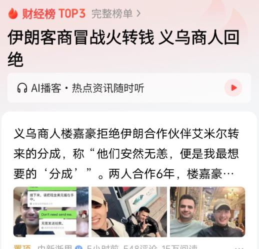 “世界级格局!”3月6日,浙江义乌,一男子与伊朗商人做生意,因美以伊冲突,有三百万的货物被困在当地。结果,伊朗商人冒着战火在边境找网,主动联系男子转账外贸分成,被男子果断拒绝,一句:“钱别转,你留着,希望你平安!”暖了全世界的心! 因为近期中东地区局势紧张,美以与伊朗之间的冲突不断升级,当地港口和物流都受到严重影响,这位义乌商人价值近三百万的货物,就这样被困在了伊朗,迟迟无法运转,给他带来了不小的压力和损失。 在这样混乱危险的情况下,很多人都会担心合作方失联、货款无法收回,这位义乌商人也做好了短期无法结算的准备。 可让他没想到的是,这位伊朗伙伴始终没有忘记诚信,即便身处战火之中,生活和安全都受到威胁,当地网络也基本中断,还是想尽办法履行承诺。 为了能联系上义乌商人并转来应得的外贸分成,伊朗商人冒着危险赶到边境地区,在山区里四处寻找微弱的网络信号,只为把这笔钱按时转过去,不辜负多年的合作情谊。 当义乌商人收到转账提醒时,心里既感动又心疼。他很清楚,在战火纷飞的伊朗,这笔钱对伊朗商人来说至关重要,是用来购买生活物资、保障家人安全的救命钱,远比自己的生意分成更加重要。 虽然自己也面临货物被困、资金周转的压力,但他没有丝毫犹豫,果断拒绝了这笔转账,还特意叮嘱对方,钱一定要自己留着,保障平安才是最重要的。 这件事很快在网上传开,很多网友都称赞这位义乌商人有格局、有温度,在利益面前守住了人心,也展现出中国人的善良与仗义。而伊朗商人在困境中坚守诚信、不忘承诺的举动,同样让人敬佩。 两人合作多年,没有因为战乱产生隔阂,反而在最艰难的时候相互体谅、彼此守护,用最朴素的行动,诠释了什么是跨国之间的真诚与道义。 在很多人看来,生意场上利益为先,可这两位普通人却用实际行动证明,真正长久的合作,靠的不是合同和利益捆绑,而是发自内心的信任与善意。 这份跨越国界的情义,比任何财富都更加珍贵,也让人们在战火的阴霾中,感受到了温暖与希望。