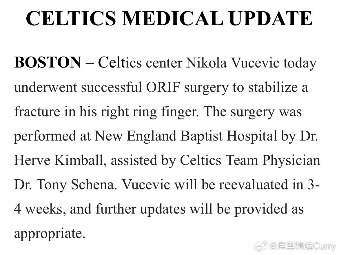 武切维奇接受右手无名指骨折手术,3-4周后复查。