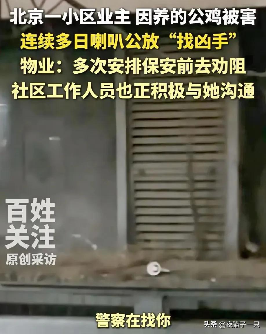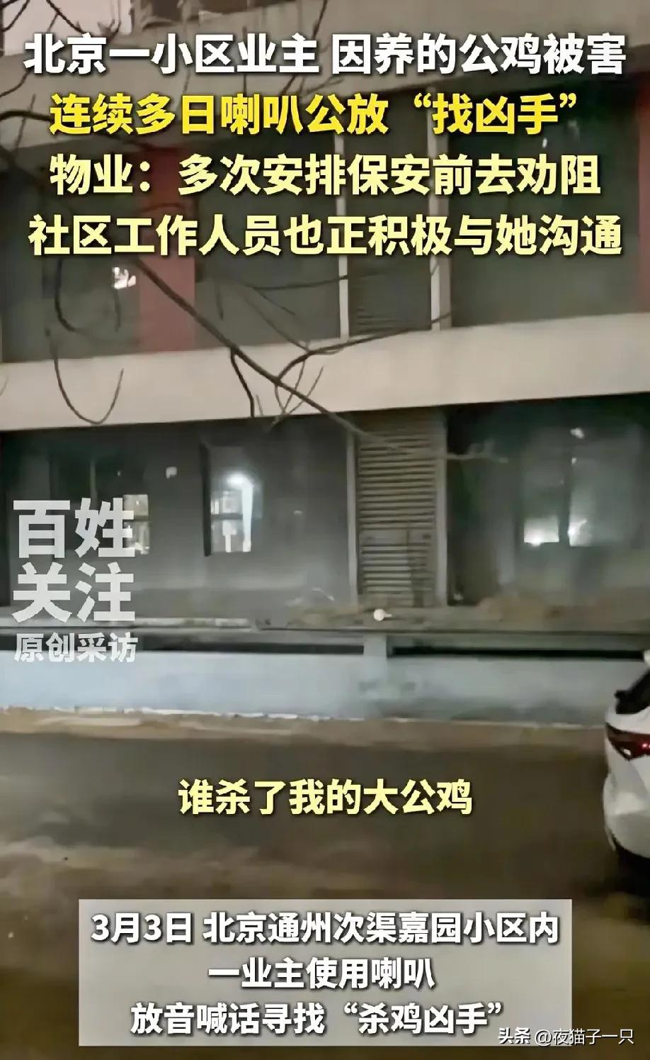 一只公鸡死了,主人用喇叭喊了五天,整栋楼睡不着 在北京四渠家园,三月初的时候,一户人家养了六年的公鸡被发现死在车库旁边,这鸡从小和家里孩子一起长大,主人早就把它当成亲人,直接买了个大喇叭挂在窗外,一遍遍喊着“谁杀了我的鸡”,后来变成喊“还我心——”,从晚上一直喊到早上,声音大到邻居关窗都挡不住。 有邻居录了音,发到群里,很快传到抖音和微博,大家开始玩梗,有人配上音乐剪成深夜电台节目,有人P图做“鸡魂通缉令”,一开始还有人同情喊话人,觉得挺惨的,但没过两天,风向变了,网友翻出监控片段,发现喊话人白天照常上班买菜,夜里却持续高声喊叫,导致附近住户人家连续好几晚没法睡觉,有人干脆搬到酒店去住。 小区中介提到这件事后,带看量掉了一半多,挂牌价格也跟着往下压,三套房子挂了三个月没人来问,租客一听是四渠家园就摇头,说害怕半夜听到喊魂的声音,有位业主私下里讲,以前这小区靠着学区和绿化能卖出高价,现在被中介悄悄标成情绪事故楼盘,连物业费收得都比别的地方难。 喇叭响起的时候,技术把情绪放大了十倍《北京市环境噪声污染防治办法》里明确规定,居民区不能使用高音喇叭,你以为自己在讨回公道,别人却觉得你在制造噪音,感情本身没错,但公共空间不是私人院子。
