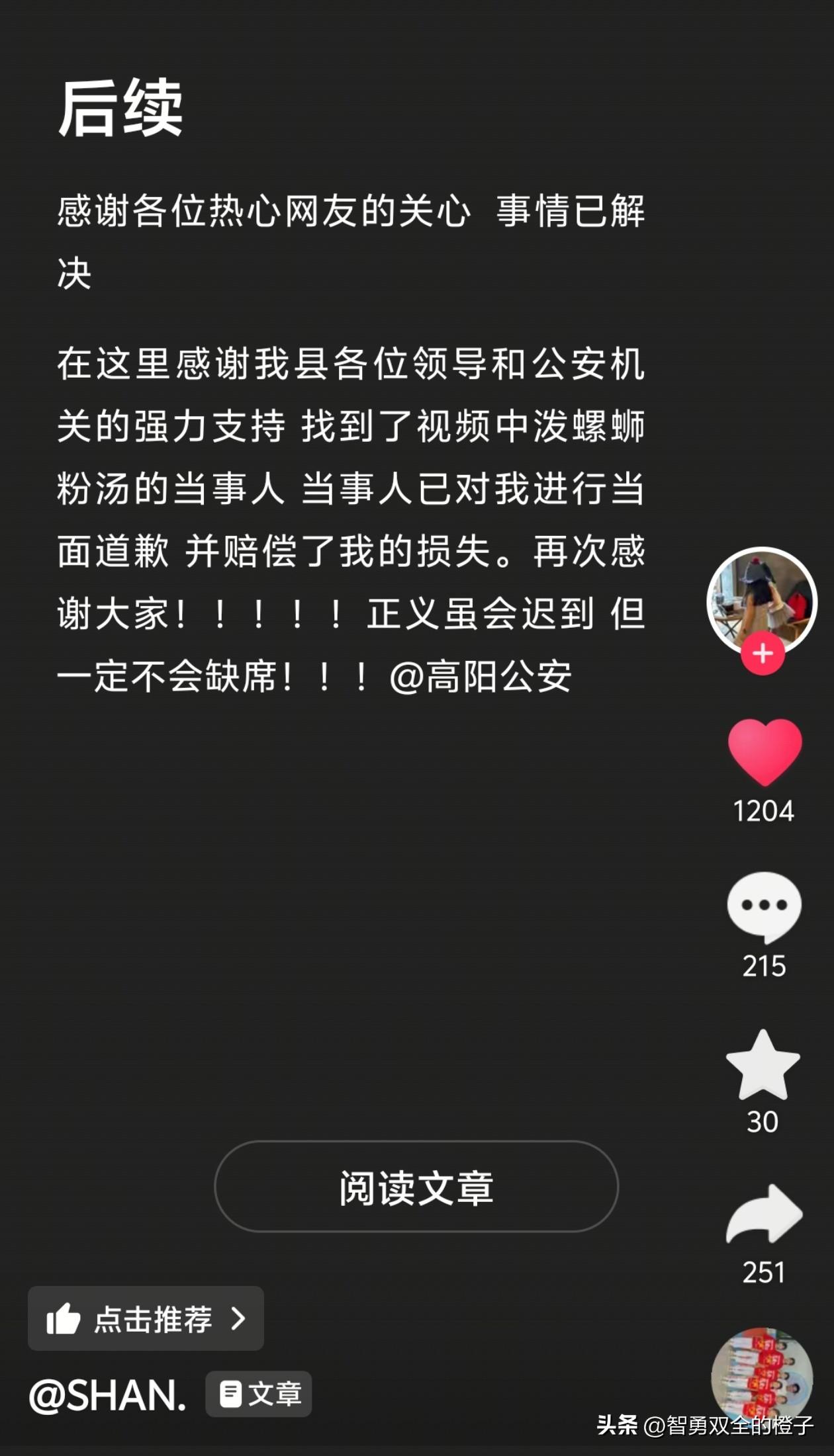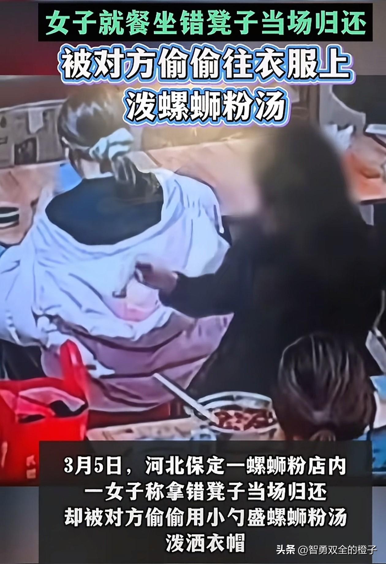 被泼螺蛳粉汤后续来了,结局令人舒适! 女孩发文说,黑衣女子找到了,对方哭着向她认错道歉,并赔偿损失,黑衣女求她把视频删了,女孩想到事情已经解决,也就答应了。 女孩说,正义可能会迟到,但一定不会缺席,感谢高阳公安,和广大热心的网友。 也不知道这种人是什么心理,当初泼别人的没想过后果,现在知道后悔了! 这下好了,全网都出名了,她身边的人一看就知道是她,已经社会性死亡,这么想结局也挺舒服的! 大家怎么看呢?