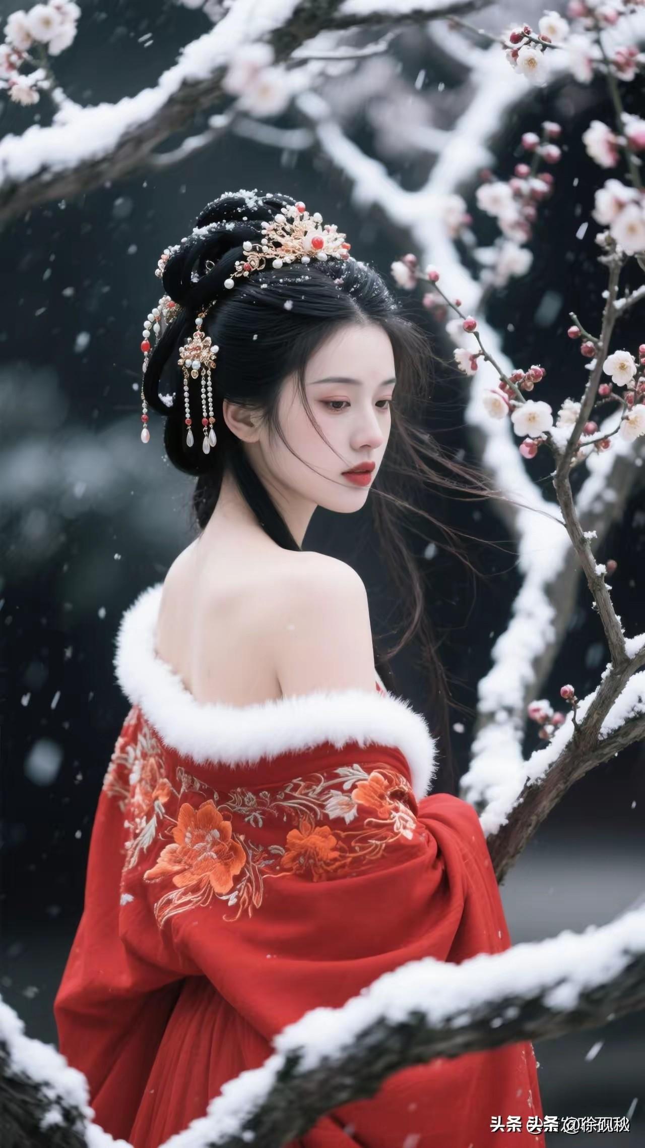 红衣白雪,古典美人。 梅雪相依,梅雪迎春。 梅雪争春未肯降, 骚人阁笔费评章。 梅须逊雪三分白, 雪却输梅一段香。
