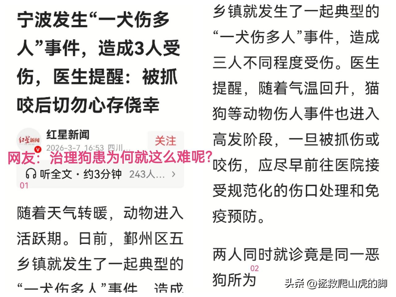 近日,宁波“一狗伤多人事件”再次让我们看到了由狗患所带来的人居环境紧张局面,同时,也再次让人们对于最新实施的《治安管理处罚法》中对于“恶狗伤人事件”中对狗主人处罚较轻,是否能达到惩罚目的和治理效果等产生更大的质疑。 当下我国由恶狗伤人造成的社会矛盾等日渐增多,如何更好地处理这类问题和由此引发的社会矛盾等,确实对政府和相关职能部门的智慧和治理能力是一个检验和考量。 记录我的2026 晒图笔记大赛
