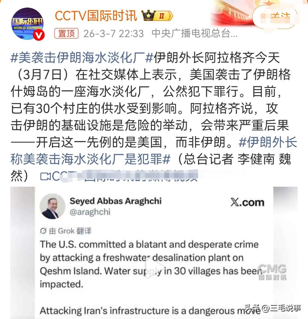 美国实在是太丧心病狂了,老是针对平民干坏事。 美国又干坏事。 3月7日(报道),美袭击伊朗海水淡化厂,导致已有30个村庄的供水受到影响。 美国这样的行为简直就是谋杀呀。 毕竟人不喝水会渴死啊。 太坏了。