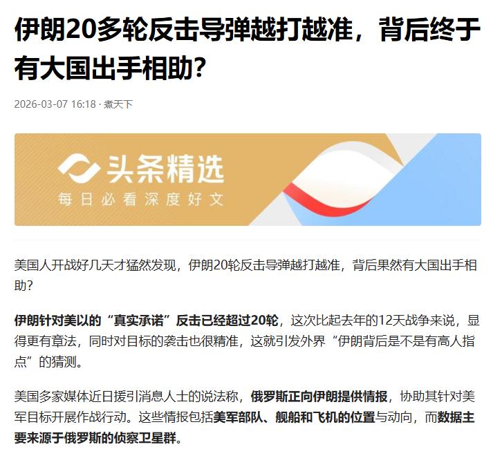 伊朗导弹越打越准,背后果然有大国暗中相助?答案很明显 美以狂轰伊朗这么久,最让美国人懵圈的是,伊朗的反击一轮比一轮有章法,导弹也越打越准,不光精准摧毁美军的反导雷达,还能拿出高清卫星照片当证据,这根本不是伊朗原本的实力能做到的,难免让人猜测,背后是不是有大国出手相助。 不用猜也知道,外界议论的这个大国,就是俄罗斯。美媒早就爆料,俄罗斯在暗中给伊朗提供情报支持,用自己的侦察卫星,给伊朗传递美军舰船、战机的位置信息,这也是伊朗导弹突然变精准的关键。虽然没有确凿证据,俄方也不承认,但种种迹象都藏不住。 有人说俄罗斯太鸡贼,明面上不送武器,暗地里递情报,其实这都是美国逼的。当初美国联合北约,给乌克兰提供全方位情报支持,帮着乌克兰对付俄罗斯,现在俄罗斯不过是以其人之道还治其人之身,帮伊朗拖垮美国,何错之有?而且美国对俄罗斯的制裁已经用到极限,根本没辙再施压。 俄罗斯的心思很简单,就是不想亲自下场,却能靠着给伊朗递情报,消耗美国的实力,削弱美国在中东的影响力,还不用承担太大风险。伊朗本身也够硬气,导弹都是自己造的,俄罗斯只是搭把手。美国现在只能吃哑巴亏,毕竟是自己先带头搞双标,这场博弈,美国注定占不到便宜。至于俄罗斯到底给了多少情报支持,还有很多细节等着揭开。