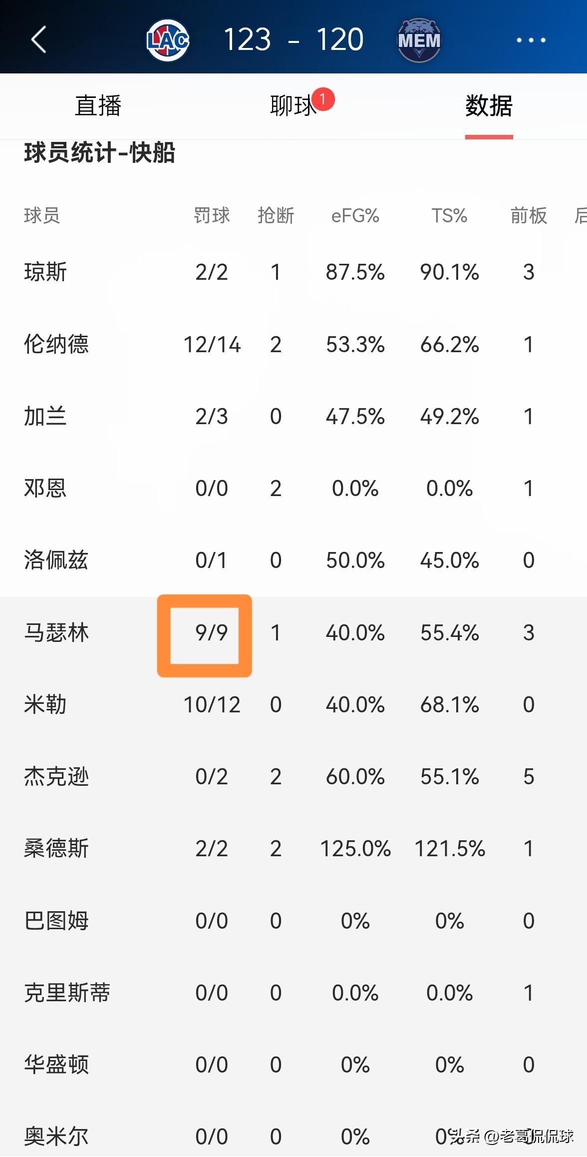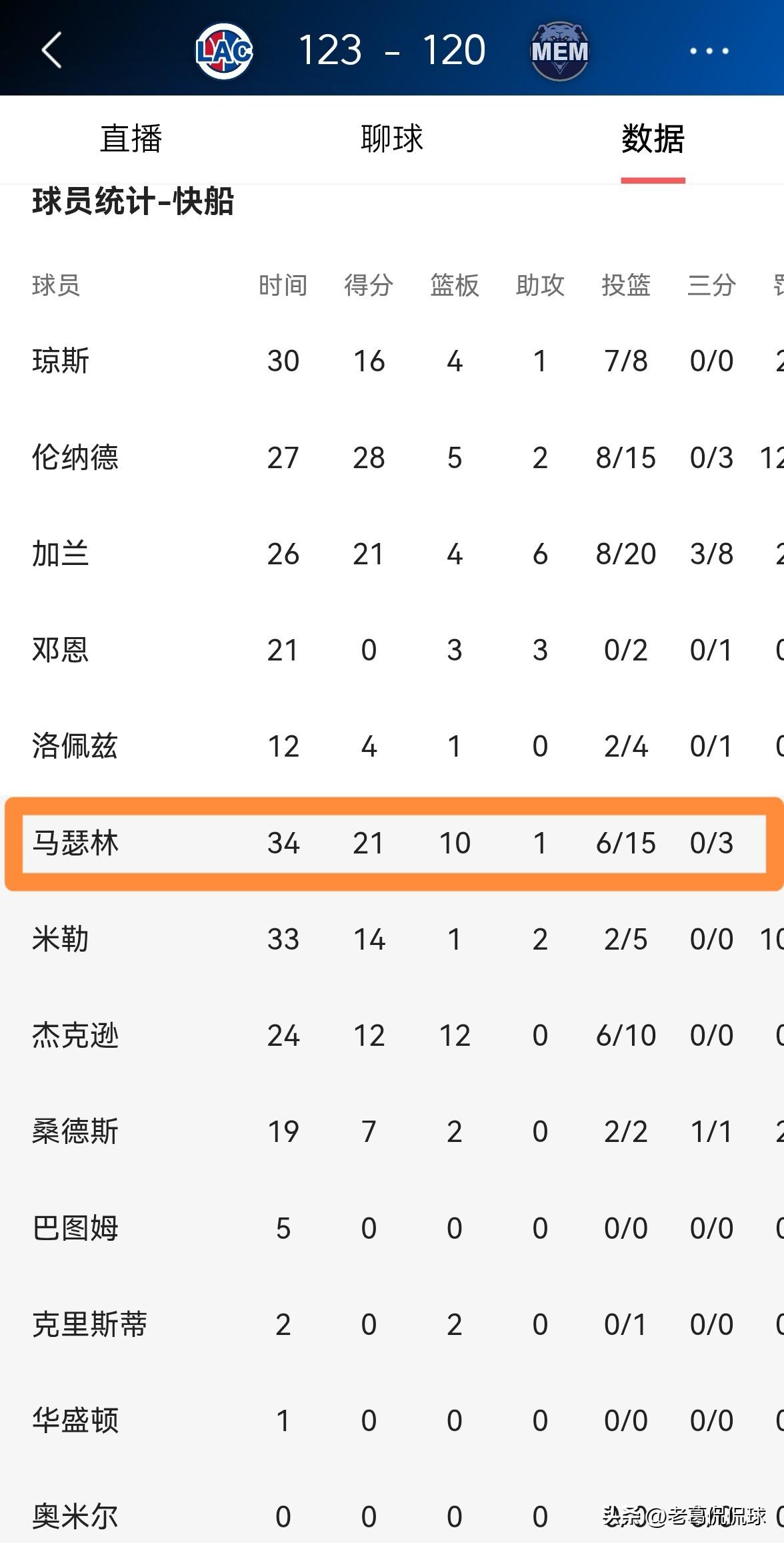 快船大将马瑟林的篮下冲击力真是太强了!在今天快船客场以123:120力克灰熊的比赛中,虽然马瑟林的进攻效率不高,但是他却博得了9次罚球,展现出了非常强的篮下冲击力。 整场比赛下来,马瑟林替补出战34分钟,投篮15中6,其中三分球3中0、罚球9中9得到21分,外加10篮板1抢断1盖帽,他的场上正负值为-2。 事实证明,当快船陷入到得分荒的时候,马瑟林对于篮筐的冲击将会成为球队破局的重要手段。