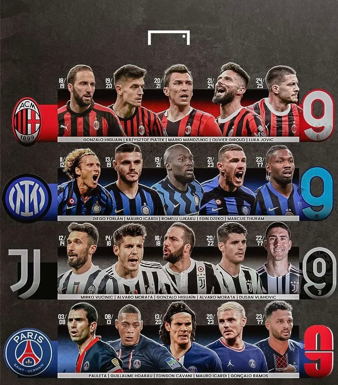 欧冠 GOAL统计了米兰、国米、尤文、巴黎史上最近的五个9号球员,你认为各自球队哪个更强?巴黎圣日耳曼