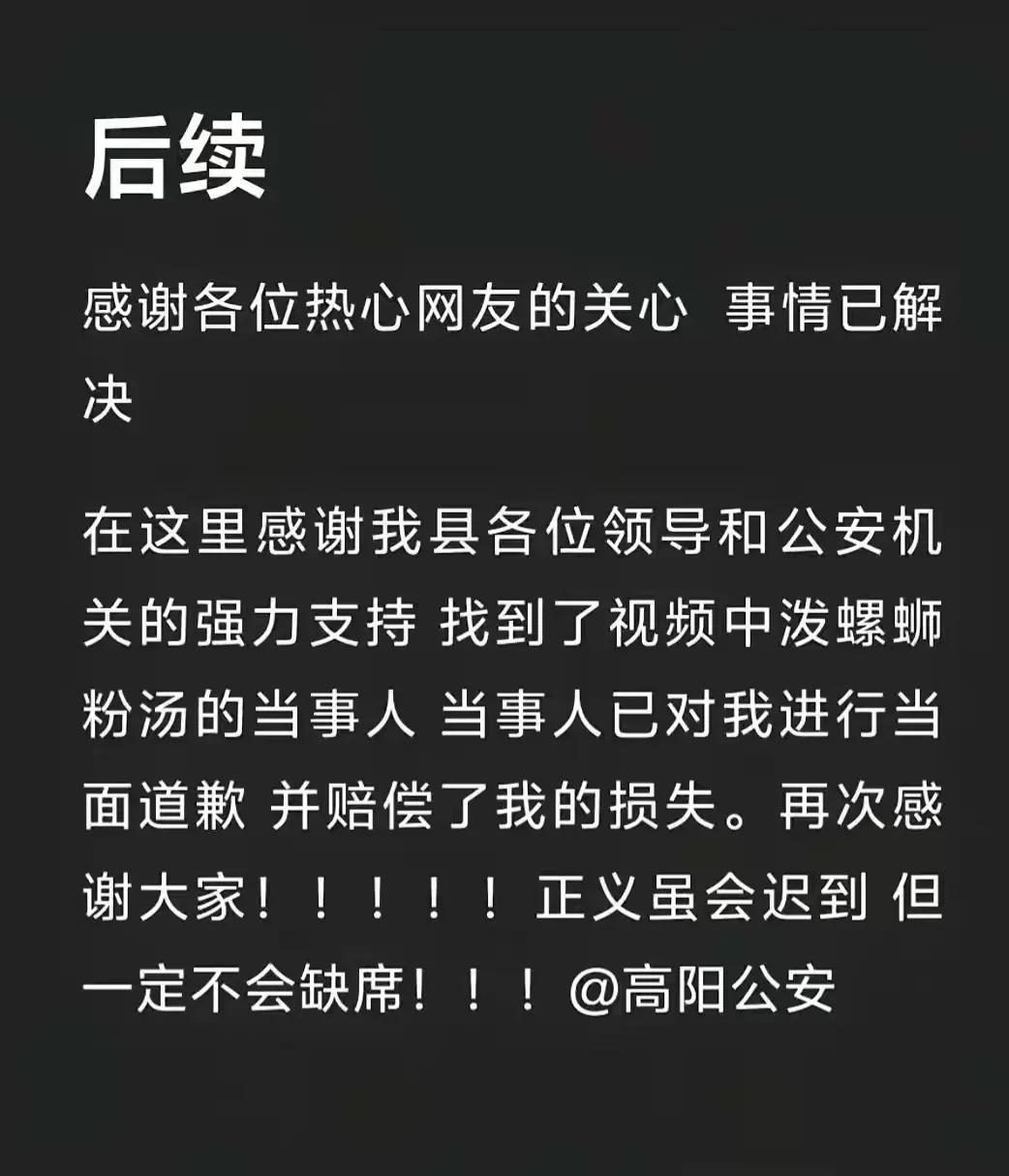 泼汤这事儿,结局看着挺解气,细咂摸却透着股人性的幽暗。人找着了,那是高阳公安排面大。 之前那一泼多嚣张?如今被拎出来,赔偿、道歉,哭着喊着求删视频。 这眼泪,真的是流给受害者的吗? 多半不是。那是怕了,怕镜头里的嚣张被扒得底朝天,怕工作丢了、名声臭了,怕往后走到哪儿都被人戳脊梁骨。说到底,不是幡然醒悟要为自己的冲动买单,是被舆论和规则摁着脑袋,不得不低头。 想想受害者当初发视频时的委屈,一碗热汤泼在身上,心疼的不只是衣服,还有被当众羞辱的难堪。她抱着手机求助,不是为了那点赔偿,是想讨个公道,想让那个随手泼汤的人知道,情绪再差也不能这样撒气。可直到视频发酵、警方介入,对方才肯站出来,这份“诚意”里,藏着多少被逼无奈的算计。 更扎心的是,这种“事后认怂”的戏码,在生活里太常见了。开车加塞被拍了才下车鞠躬,公共场所撒野被录了才哭着求饶,平时横得不行,一看见镜头和执法人员,立马换了副面孔。他们怕的从来不是“做错事”,是“做错事被看见”。 受害者说“正义虽会迟到但不会缺席”,听着解气,可这迟到的正义,耗掉的是普通人的耐心和信任。要是没有网友转发、没有警方介入,那碗泼出去的汤,是不是就成了没人管的委屈?我们总盼着“恶有恶报”,可很多时候,恶的收敛,从来不是因为良心发现,是因为代价够大。 别觉得这只是一碗螺蛳粉汤的小事,它照出的是最真实的人性:没被约束时,戾气可以随意倾泻;要承担后果了,才想起要装出一副谦卑的样子。我们该庆幸有网络和规则能帮受害者讨回公道,更该清醒,真正的文明,从来不是靠“被抓才认错”,而是从一开始就懂得,别把自己的坏情绪,泼在无辜的人身上。 各位读者你们怎么看?欢迎在评论区讨论。