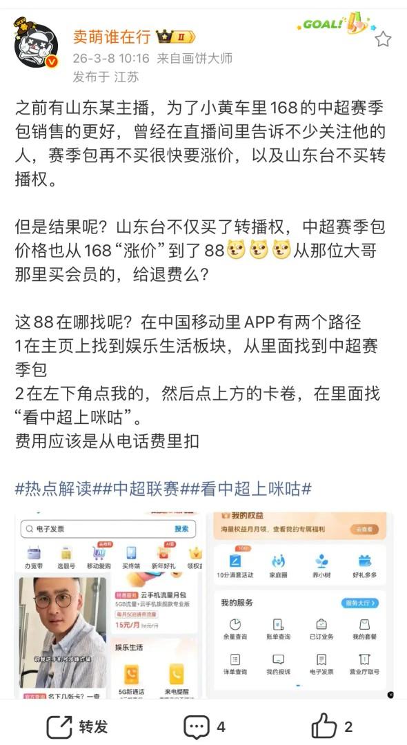 知名博主“卖萌谁在行”:某博主卖的168中超赛季包,现在卖88 该博主还放出了购买渠道,真的算是为球迷着想了,反观某博主,为了卖168的赛季包,大肆渲染山东体育台不再播泰山队比赛。 因为咪咕对中超有独家版权,其他电视台、媒体想直播,必须从咪咕买,所以很多球迷都信以为真了。 现在看来,山东电视台体育频道,作为电视台,还愿意花钱直播泰山队的比赛,已经是对球迷相当好了。 山东泰山队