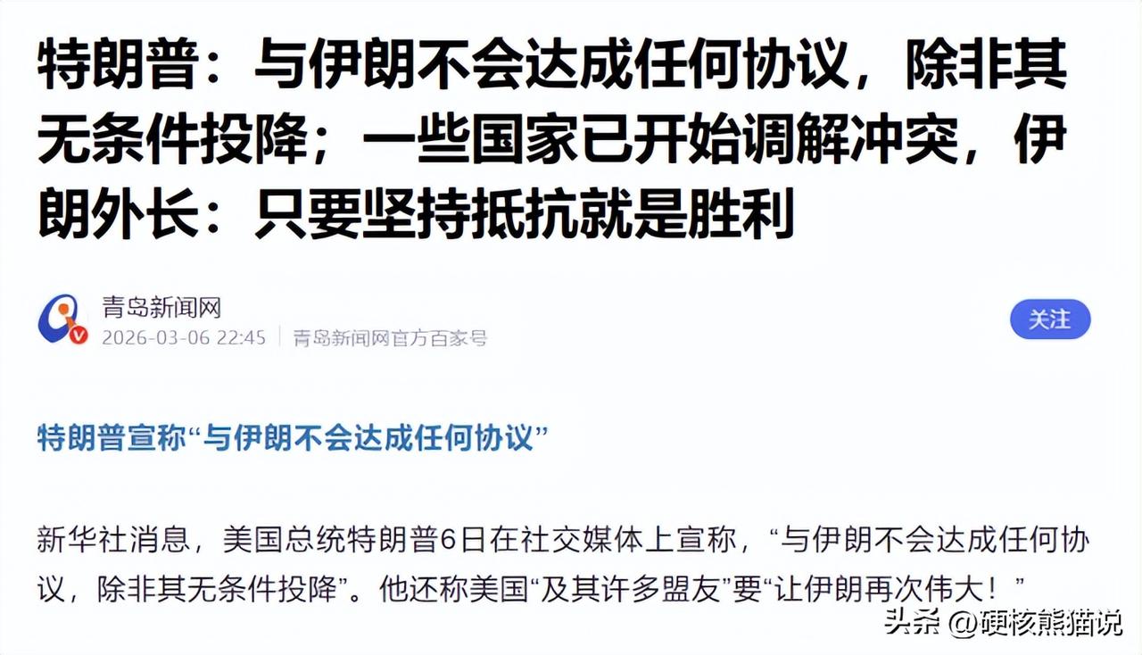 特朗普还是没搞清楚形势啊,刚刚放出豪言,就被伊朗和美国官方自己怼脸了! 事情是这样,3月6号的时候,特朗普不是在媒体上公开要求伊朗无条件投降吗?伊朗总统直接贴脸开大表示决不无条件投降! 本来到这边也没啥,结果美国官方又出来秀了一波下限,白宫新闻秘书莱说,特朗普说的无条件并不是真的无条件,而是当他认定伊朗不再对美国有威胁,还有什么目标都实现的时候,不管伊朗是否愿意,就是无条件投降。 这直接把我们干懵了,只听说过败者投降,没有听说过单方面定义别人投降的! 果然没有人比特朗普更懂无条件投降了。 但特朗普这次大概率要失望了,伊朗这次不仅不会无条件投降,而且让步都不会轻易让步。 伊朗如此强硬也并不是盲目自信,而是美国现在已经陷入了两难境地,在军事上,美国无法对伊朗进行毁灭性打击,而伊朗反击越来越多,十多轮的反击,几乎将美国和以色列在中东的军事重要设施打了一个遍。 美国在经过多年海外战争消耗和国内经济波动,早已无力承受一场新的长期战争,甚至伊朗已经准备了很多年,就算美国顶着经济压力,派地面部队介入,也会打赢这场战争。因此单纯从军事上看,时间就是在伊朗这边。 这就像两个牌友,一方有王炸,但剩下全是边角料,一方虽然没有王者,但大牌一大堆,两者谁输谁赢还不一定的。 伊朗有什么理由投降?当然没有,接下来就看双方怎么打了