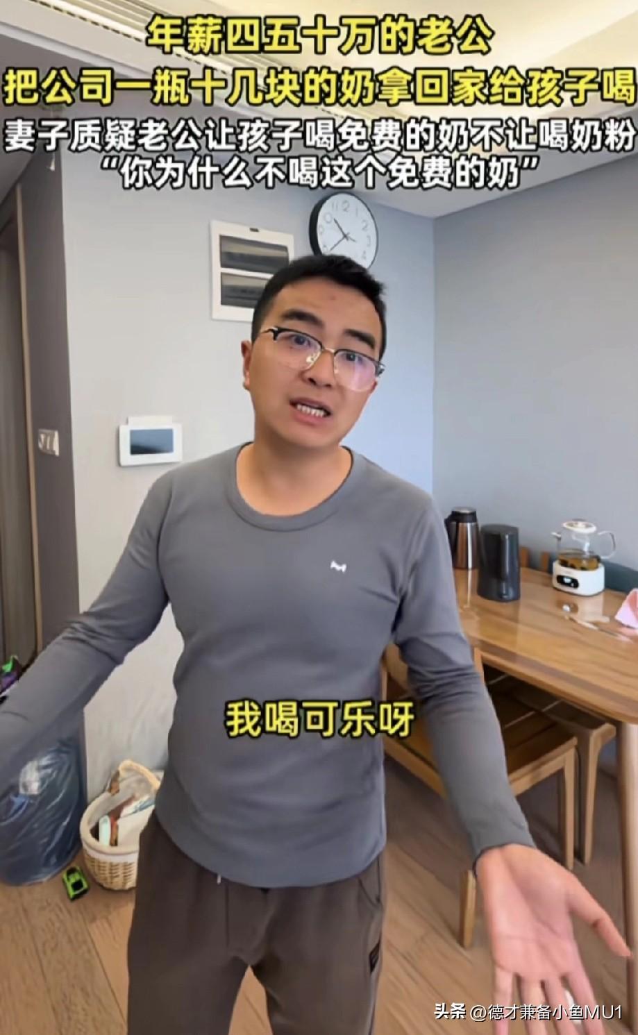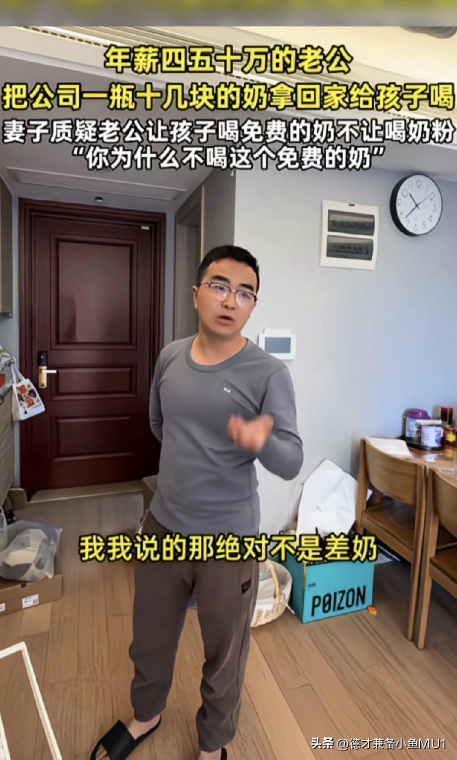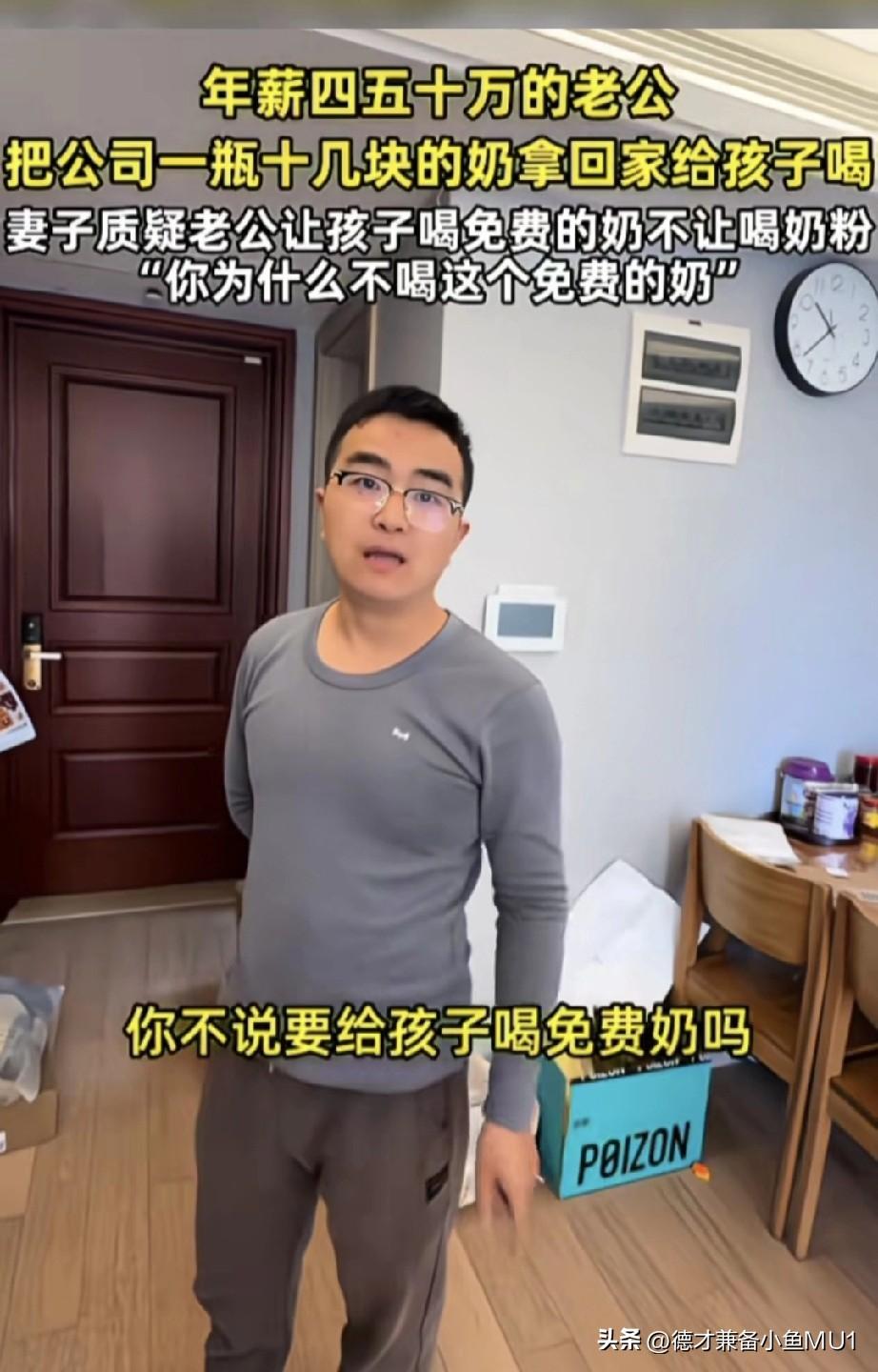 女子的老公年薪四五十万,却因把公司发的一瓶十几块钱的奶拿回家给孩子喝,引发了女子的不满,两人为此发生了争吵。 女子老公觉得公司发的这十几块钱一瓶的奶很不错,自认为身为大人无需喝,便拿回家给孩子。然而,女子却觉得免费的东西质量差,还指责道:“你自己都不喝免费的,拿回来给孩子喝。”这样的女人着实让人感到心累。 女子不停地质问老公:“你为什么不喝?你为什么不喝免费的奶?”老公回应:“我都这么大个人了,干嘛要喝奶?我平常不也喝可乐嘛。”女子又说老公败家,“你不喝免费的奶,还出去买可乐喝”,老公一脸委屈,两人争论不休。 实际上,十多块一瓶的奶已经很不错了,并非老公不喝,而是他觉得自己不缺营养,想把好奶留给孩子。这不是喝不起,而是该花的钱花,能省的就省。这和我很像,见到好东西就想带回家给孩子,并非买不起,只是觉得没必要花那冤枉钱。 我认为这位妈妈有些偏激,爸爸把奶拿回家,说明心里惦记着孩子,别觉得免费的就不是好东西,更别觉得爸爸舍不得给孩子消费。要是孩子小,不能喝这奶,自己喝了也行。我孩子他爸公司也发牛奶,孩子想喝就喝,不想喝我就喝了。 我很无语,单位发的奶,我不是不喝,而是舍不得喝,拿回家给孩子和老婆喝难道有错吗?说实话,十几块钱一瓶的奶,绝对不比普通奶粉差!免费是因为公司福利好,并非奶的质量差!孩子多大了呢?如果是婴儿,确实该喝阶段奶粉;要是上幼儿园以后,十几块一瓶的牛奶应该是鲜奶,喝这个完全没问题。 对此,大家怎么看?