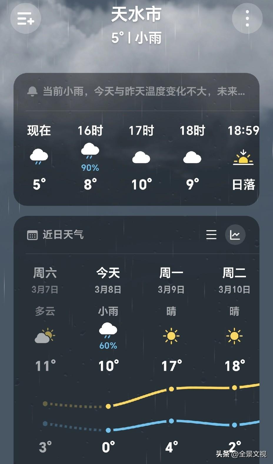 春雨贵如油。从监控里看天水老家下雨了,而且雨还不小。 西安昨天冷的很,今天感觉比昨天还冷。上午看天气预报西安也有阵雨,但这会儿又是多云天。如果西安能下点雨,天一晴马上气温就上来了。本来今天想开车回天水,看天水在下雨,就不去了,等天晴了再回去。天水肯定比西安还冷。 这几天西安冷,不知道是什么原因引起的?西安早晨下雨 天水沙尘暴 天水的天气 天水春景 陕西雾雨 天水三月的雪 天水陇南大雨