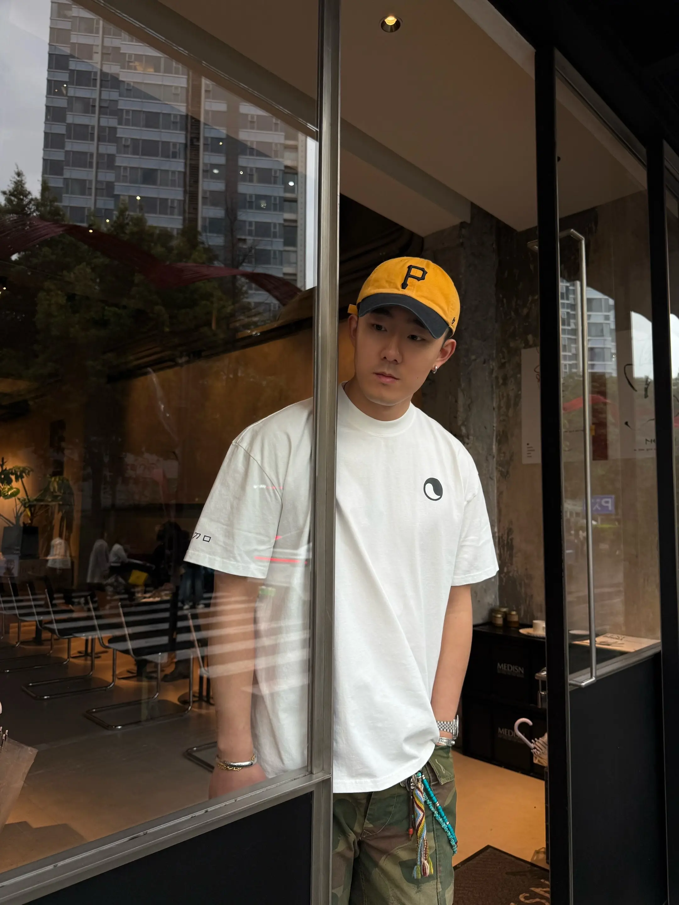 他在新加坡街头弯腰驼背,穿着松垮的大裤衩,手里还拎着一个极不协调的粉色女包。如果