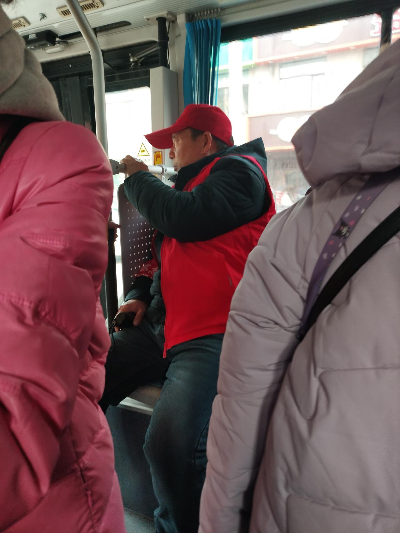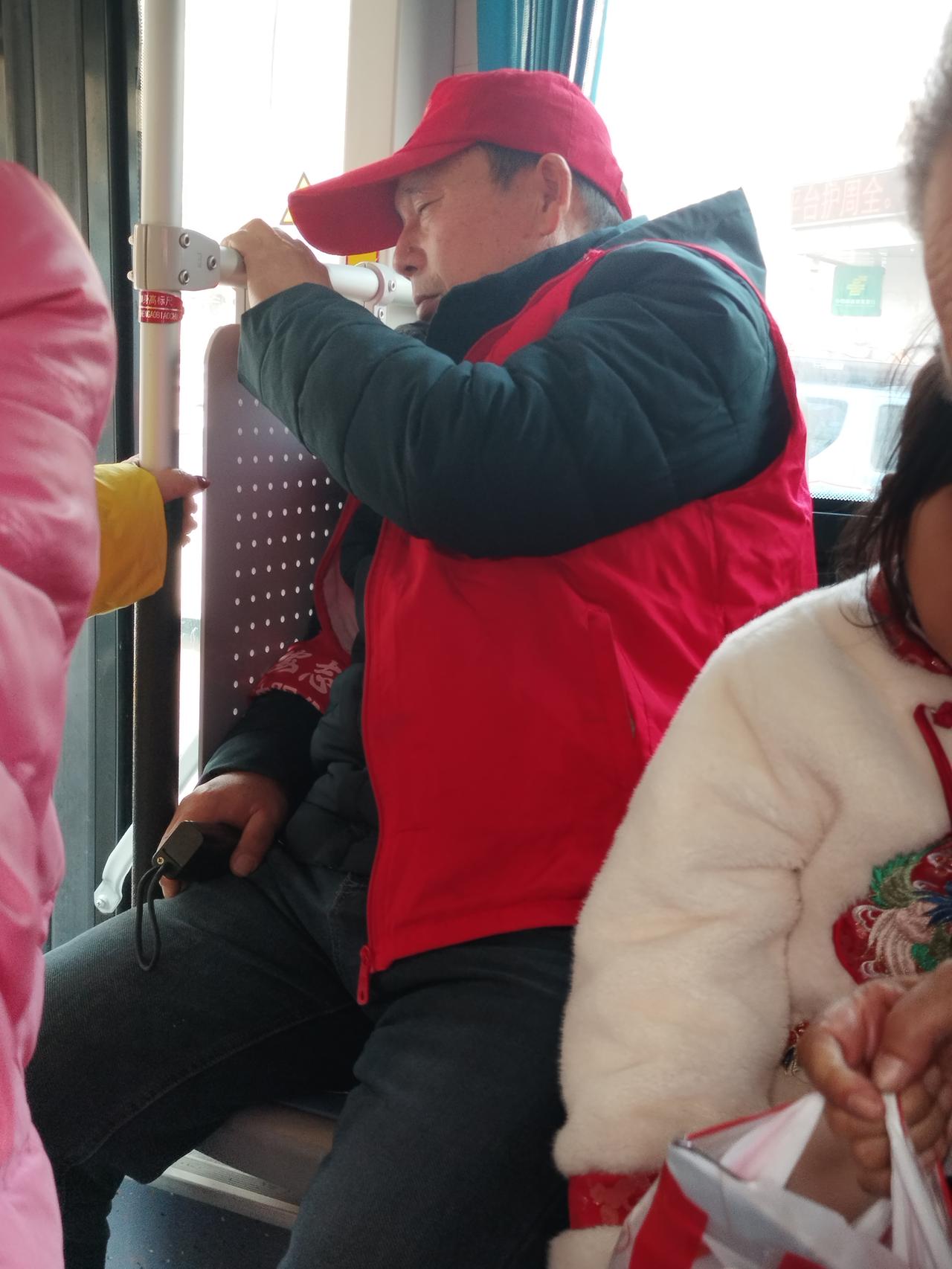 看着公交车上人满为患。 上车的头一个座,却坐着这么一个穿红马甲的人。 不知道这是干什么的人,执行什么任务,坐在座儿上直门儿睡觉。 车上人太满了,都挤不上来,却有这么一个多余的人,还占了一个座位,有什么用呢? 真不知道沈阳公交每个公交车上安排这么个人有啥用?