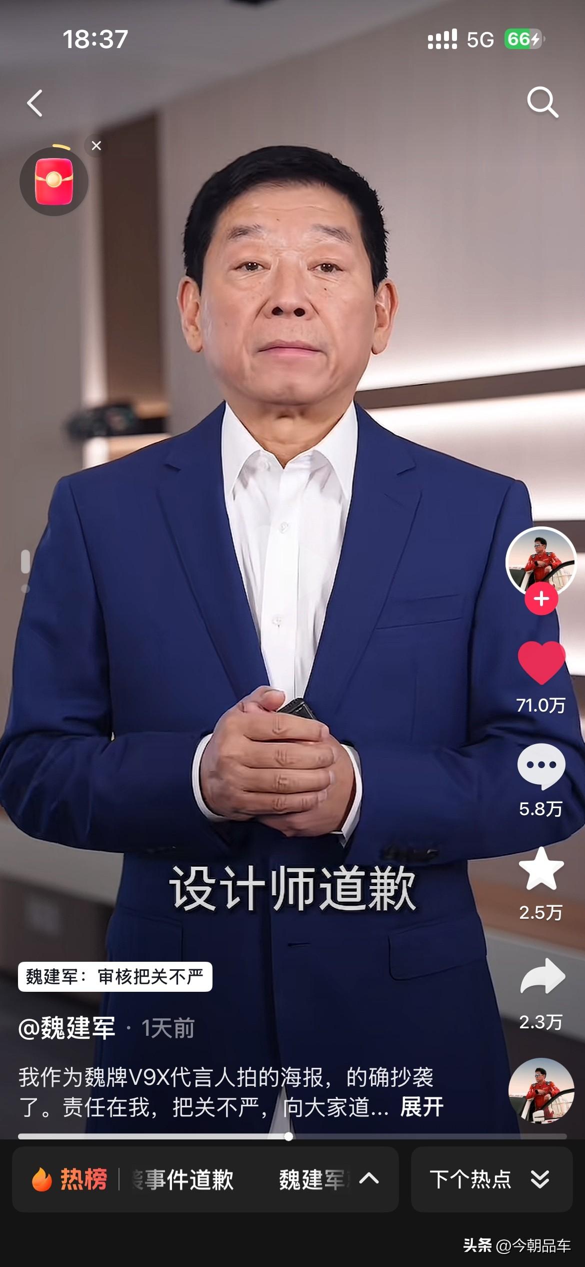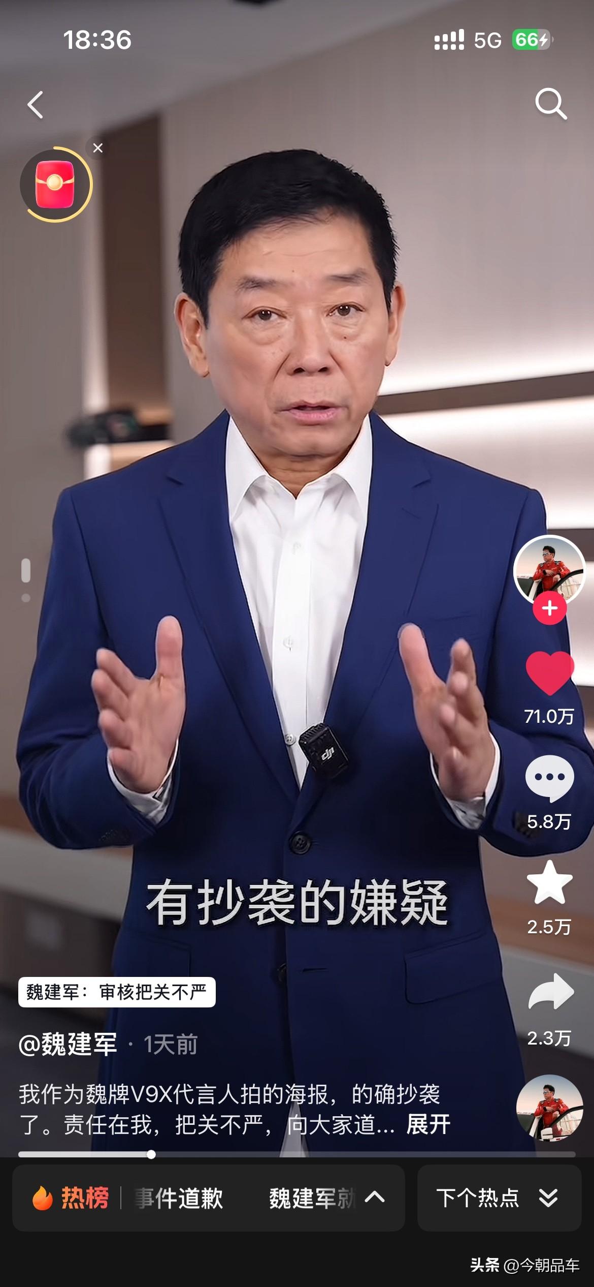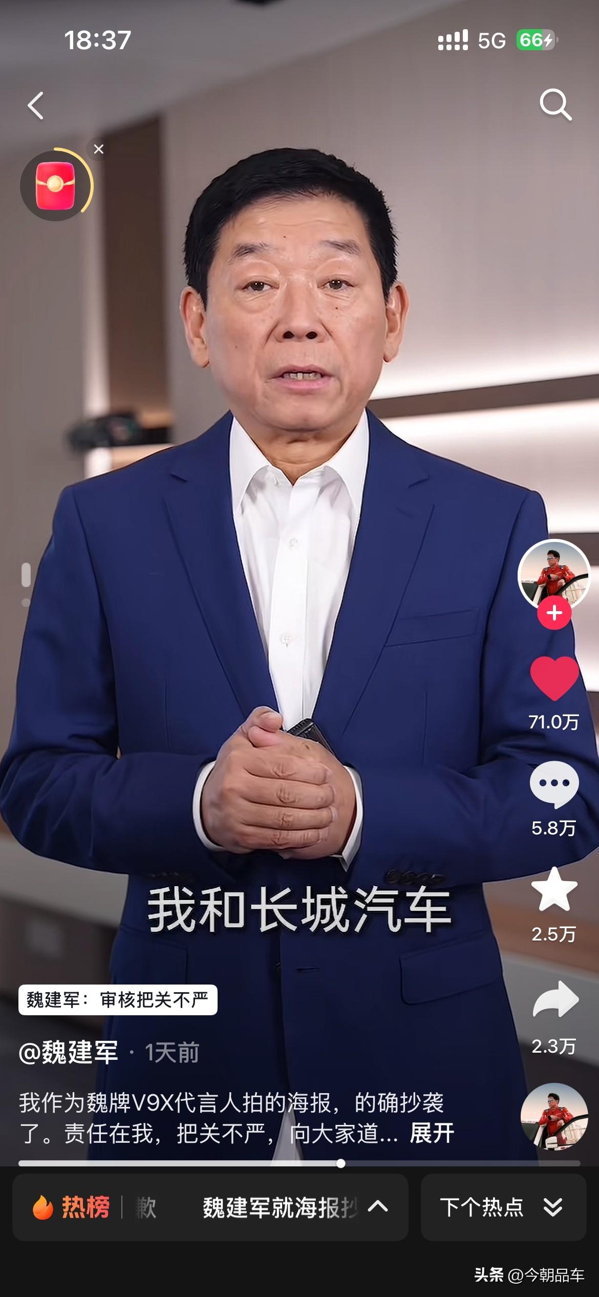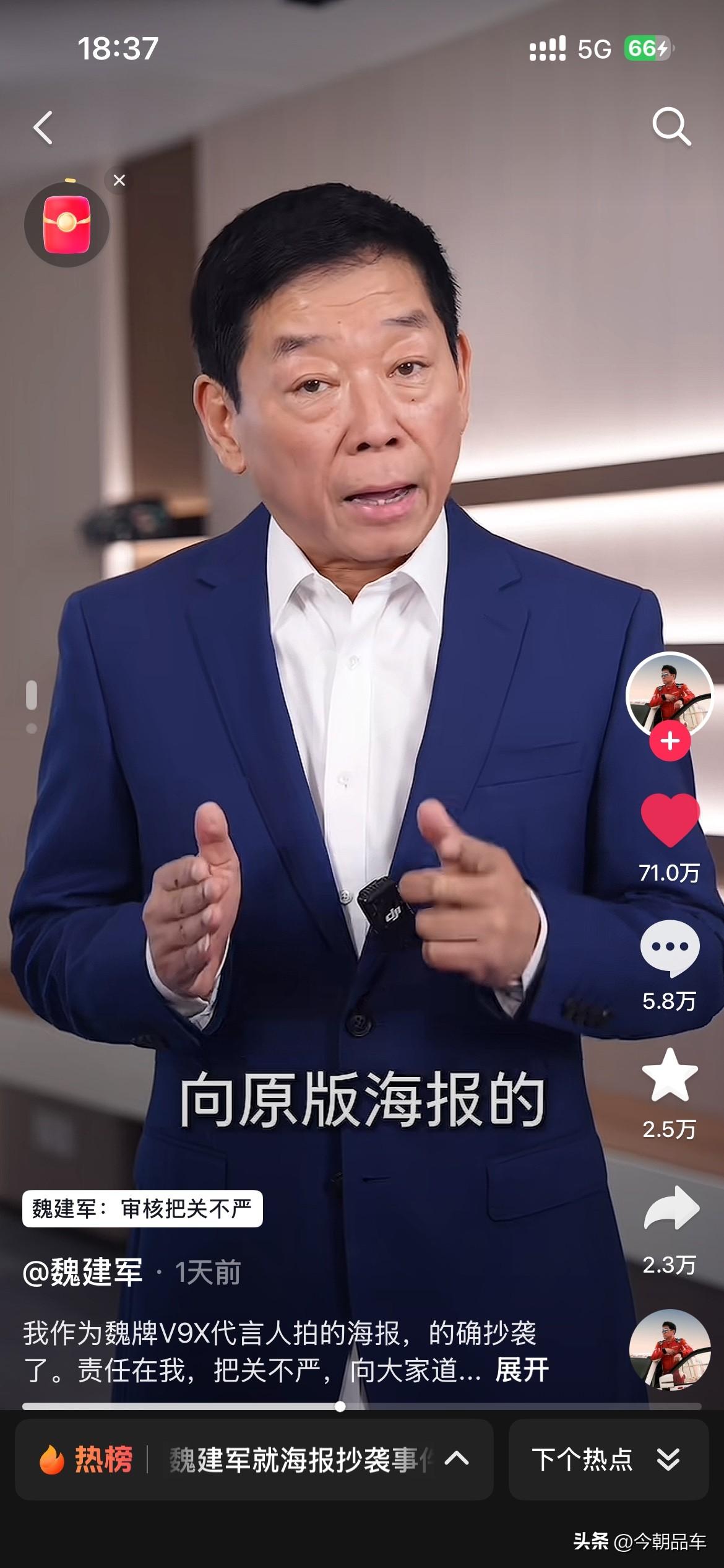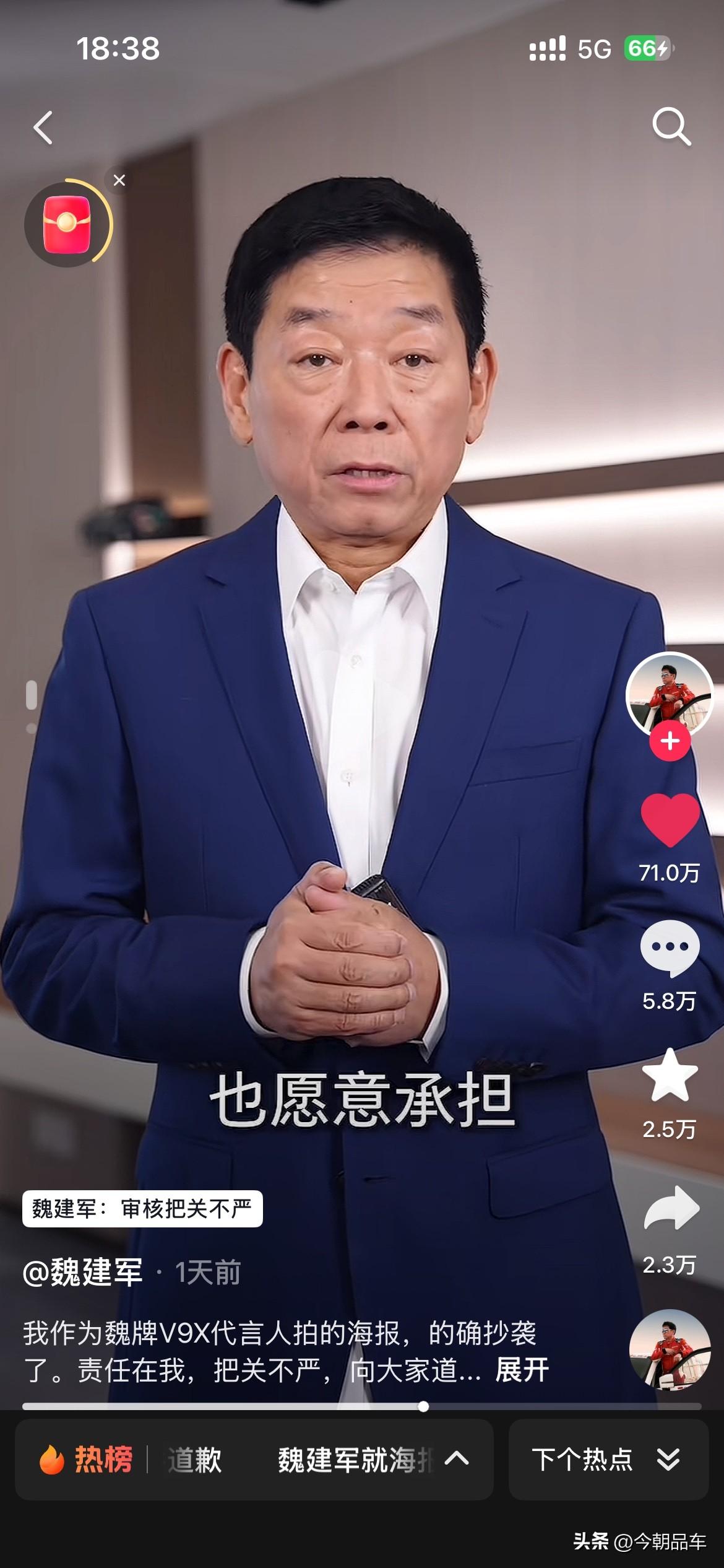 最近几天,被长城汽车创始人魏建军老师的视频震惊到了。 视频中魏建军坦言:“确系抄袭,无可辩解”,给路虎、设计师和网友三连道歉,还揽下全部法律责任。这波操作,甩了“甩锅外包”“冷处理”的同行十条街! 自主车企向上走,靠的不是抄来的创意,是敢担责的底气。别再拿“借鉴”当遮羞布,魏建军已经打了样:认错要快,担责要硬,原创才是王道!这波,老魏值得一个大写的赞! 个人觉得,魏建军老师诚恳的道歉。同时也会给咱们自主车企的掌舵人们,都打了个样。看看人家的态度?看看人家这担当?都好好学学吧,出来问题别甩锅,真诚才是永远的必杀计! 免责声明:图片来源于魏建军老师的个人账号,如有侵权,请第一时间联系删除。谢谢魏建军 长城汽车 长城汽车抄袭事件你怎么看 魏建军能否带领长城汽车翻身 魏建军道歉