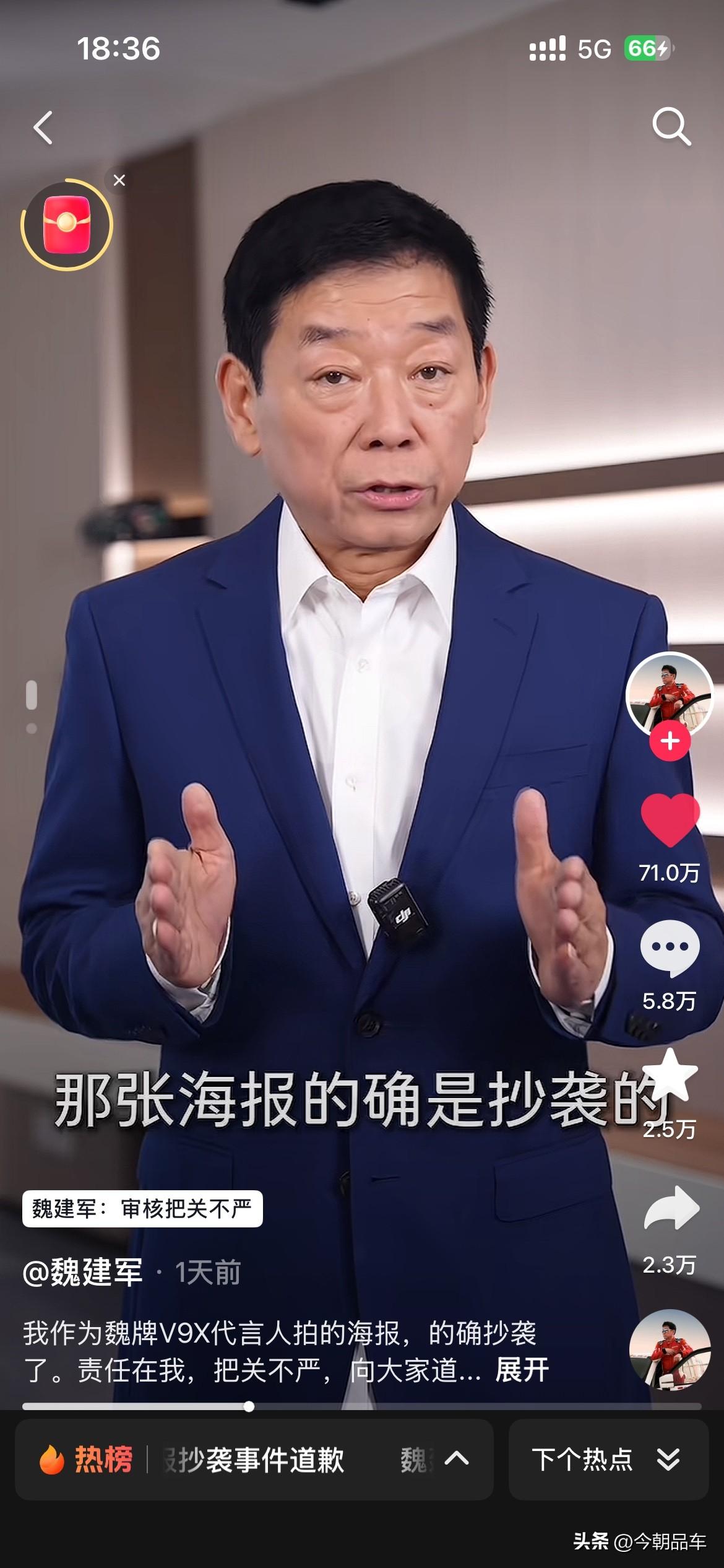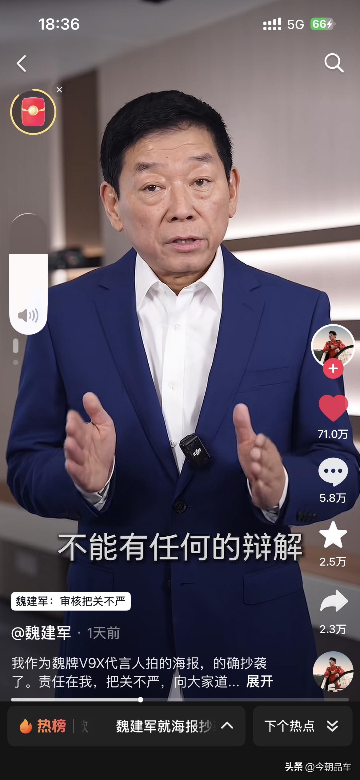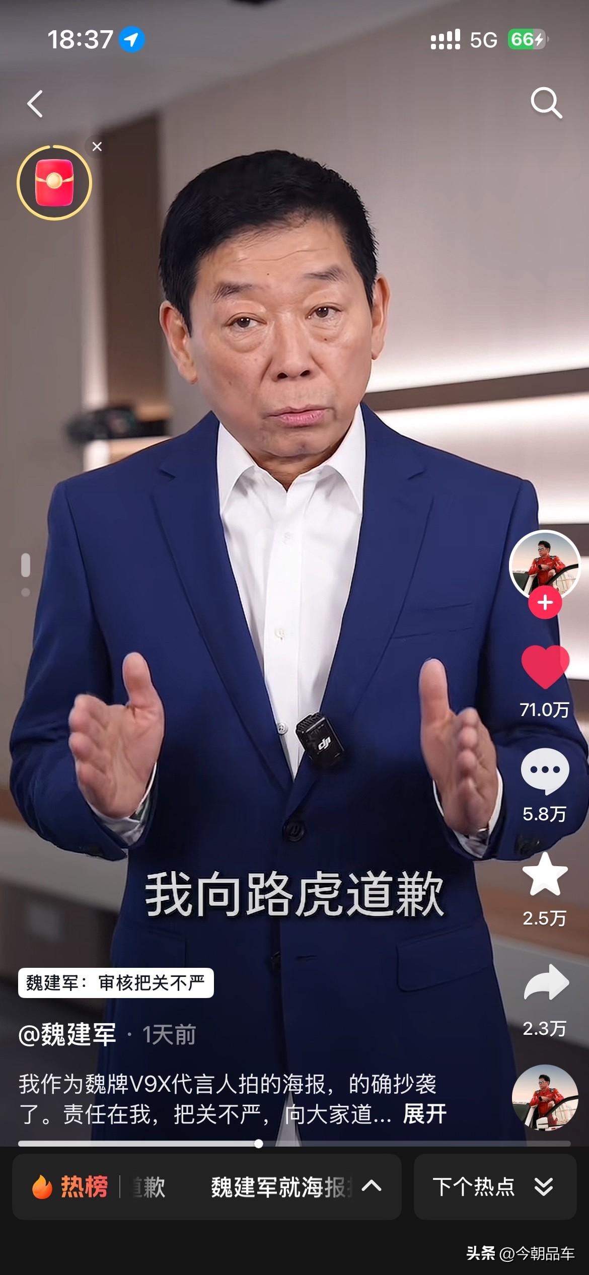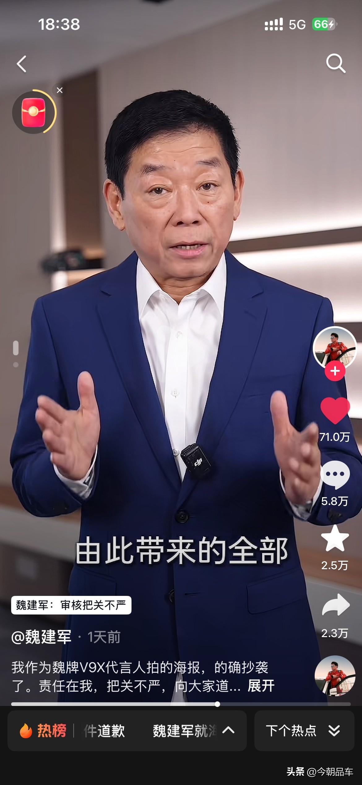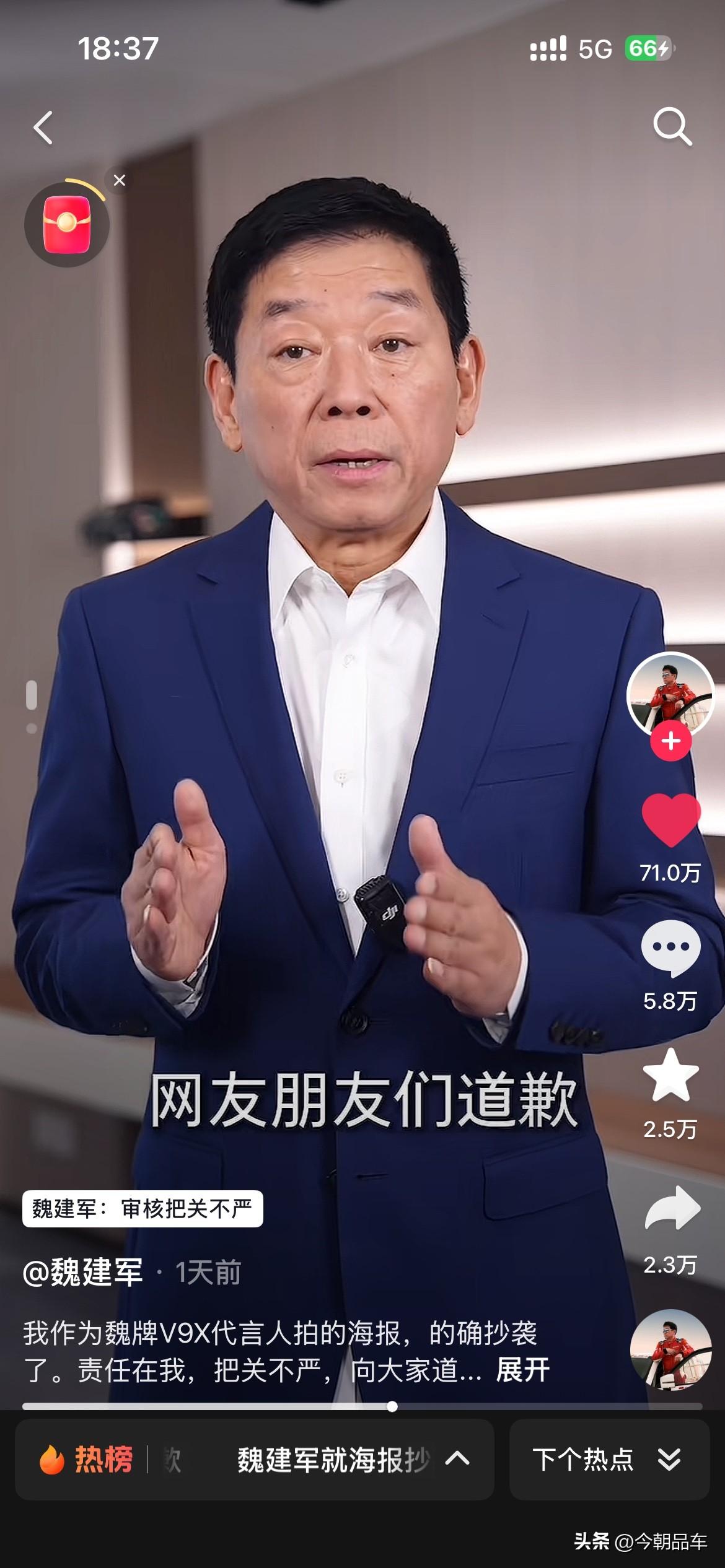 最近几天,被长城汽车创始人魏建军老师的视频震惊到了。 视频中魏建军坦言:“确系抄袭,无可辩解”,给路虎、设计师和网友三连道歉,还揽下全部法律责任。这波操作,甩了“甩锅外包”“冷处理”的同行十条街! 自主车企向上走,靠的不是抄来的创意,是敢担责的底气。别再拿“借鉴”当遮羞布,魏建军已经打了样:认错要快,担责要硬,原创才是王道!这波,老魏值得一个大写的赞! 个人觉得,魏建军老师诚恳的道歉。同时也会给咱们自主车企的掌舵人们,都打了个样。看看人家的态度?看看人家这担当?都好好学学吧,出来问题别甩锅,真诚才是永远的必杀计! 免责声明:图片来源于魏建军老师的个人账号,如有侵权,请第一时间联系删除。谢谢魏建军 长城汽车 长城汽车抄袭事件你怎么看 魏建军能否带领长城汽车翻身 魏建军道歉