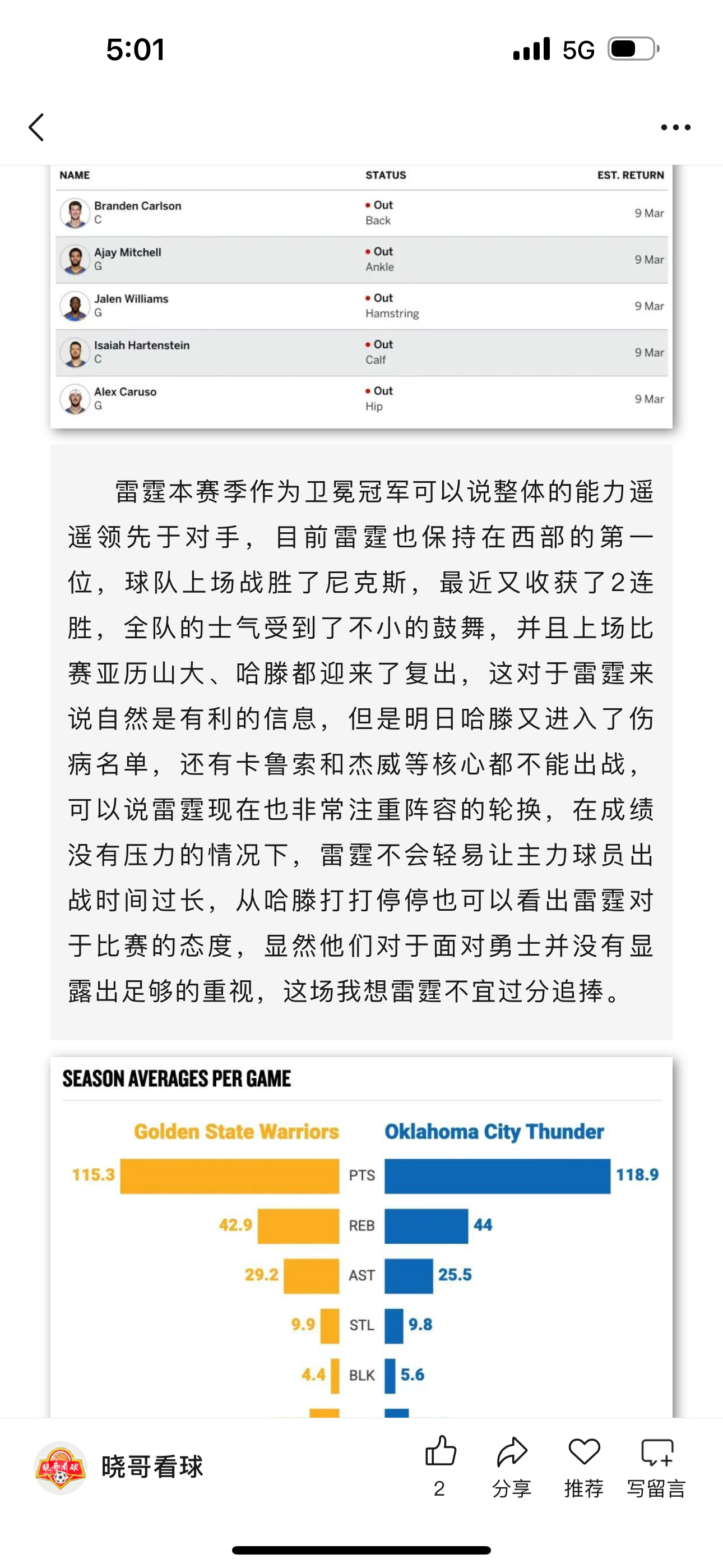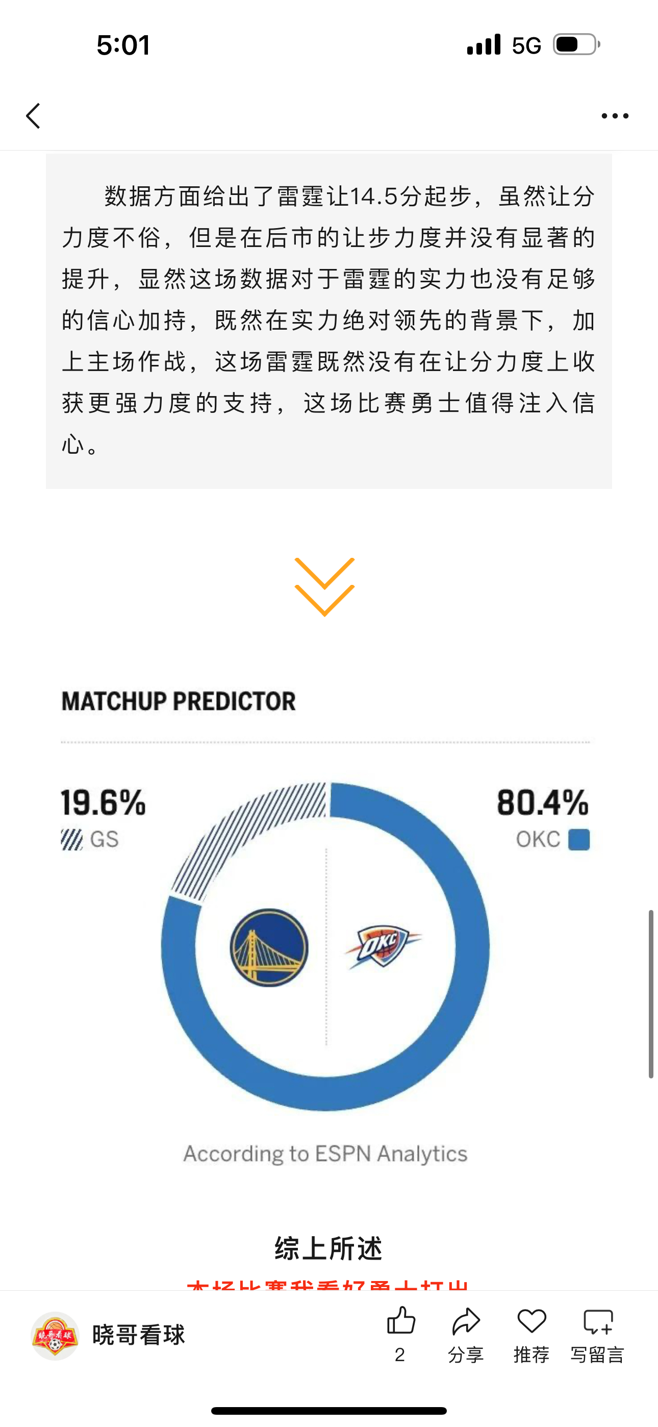 昨日分享勇士方向成功获得好评,这场我预测波津复出成功猜对,虽然替补出战却也贡献了9分5板5助攻的数据,他对于勇士防守提升肉眼可见,这场雷霆仅仅砍下104分就是最好的证明,这场分析基本准确,好评合理!篮球预测勇士体彩nba