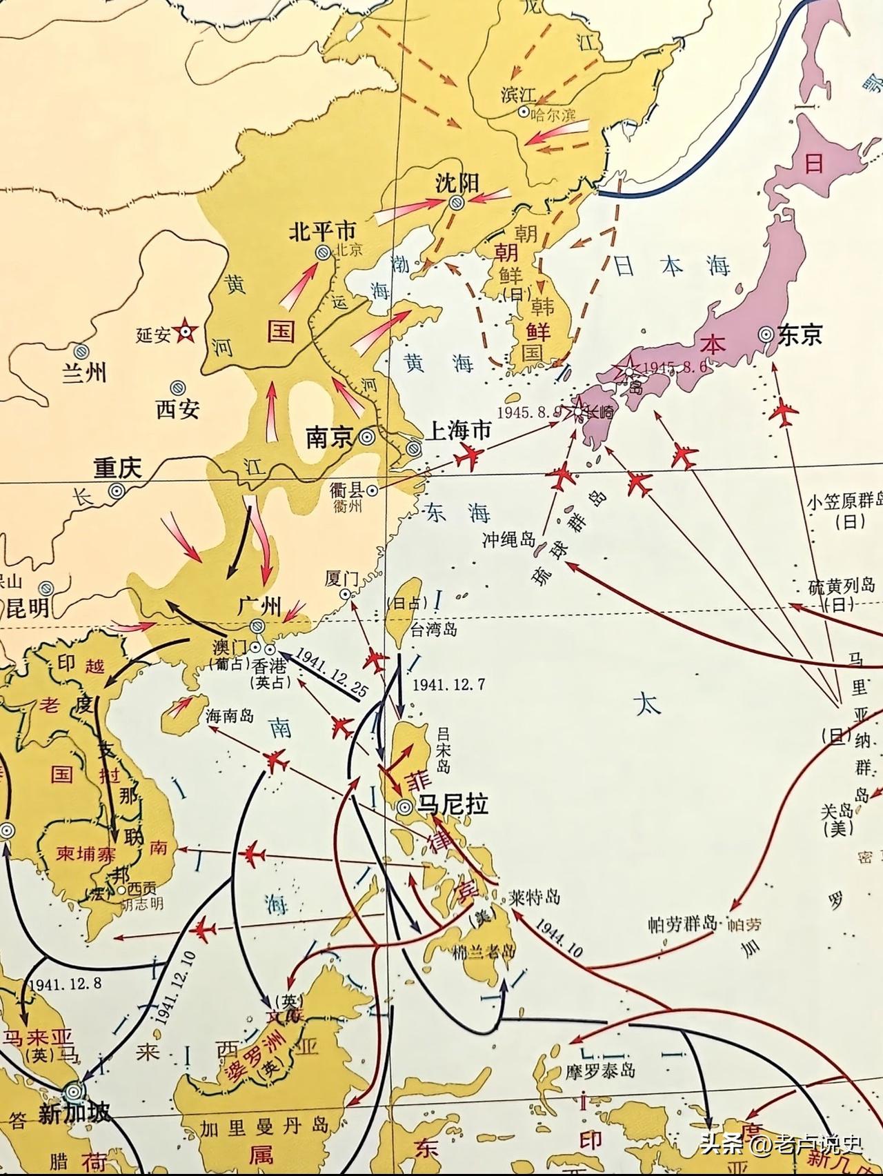 一图看懂二战后期太平洋战争形势图,美国虽然是二战后期珍珠港被袭后参战的,但却是太平洋战争的转折点,如果日本没有偷袭美国,而美国也没有加入同盟国,狠狠打击日本海军,日本会这么快投降吗? 二战