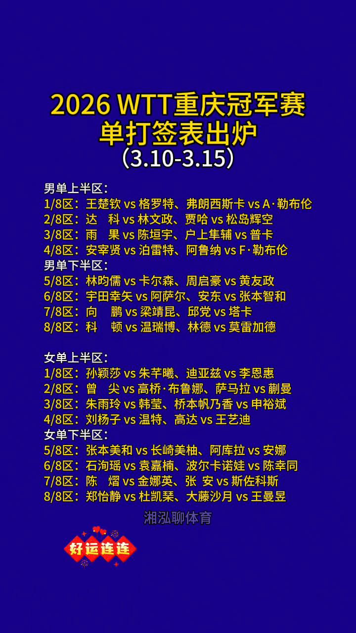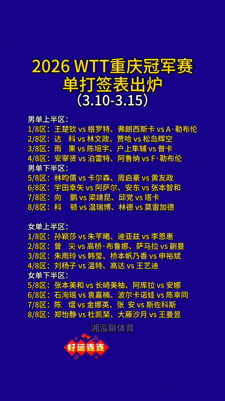2026 WTT重庆冠军赛单打签表出炉(3.10-3.15)。 ·男单上半区: →1/8区:王楚钦vs格罗特、弗朗西斯卡vsA·勒布伦。 →2/8区:达科vs林文政、贾哈vs松岛辉空。 →3/8区:雨果vs陈垣宇、户上集辅vs普卡。 →4/8区:安宰贤vs泊雷特、阿鲁纳vsF·勒布伦。 →5/8区:林昀儒vs卡尔森、周启豪vs黄友政。 →6/8区:宇田幸矢vs阿萨尔、安东vs张本智和。 →7/8区:向鹏vs梁靖昆、邱党vs塔卡。 →8/8区:科顿vs温瑞博、林德vs莫雷加德。 ·女单上半区: →1/8区:孙颖莎vs朱芊曦、迪亚兹vs李恩惠。 →2/8区:曾尖vs高桥·布鲁娜、萨马拉vs蒯曼。 →3/8区:朱雨玲vs韩莹、桥本帆乃香vs申裕斌。 →4/8区:刘杨子vs温特、高达vs王艺迪。 →5/8区:张本美和vs长崎美柚、阿库拉vs安娜。 →6/8区:石洵瑶vs袁嘉楠、波尔卡诺娃vs陈幸同。 →7/8区:陈熠vs金娜英、张安vs斯佐科斯。 →8/8区:郑怡静vs杜凯、大藤沙月vs王曼昱。 好运连连!