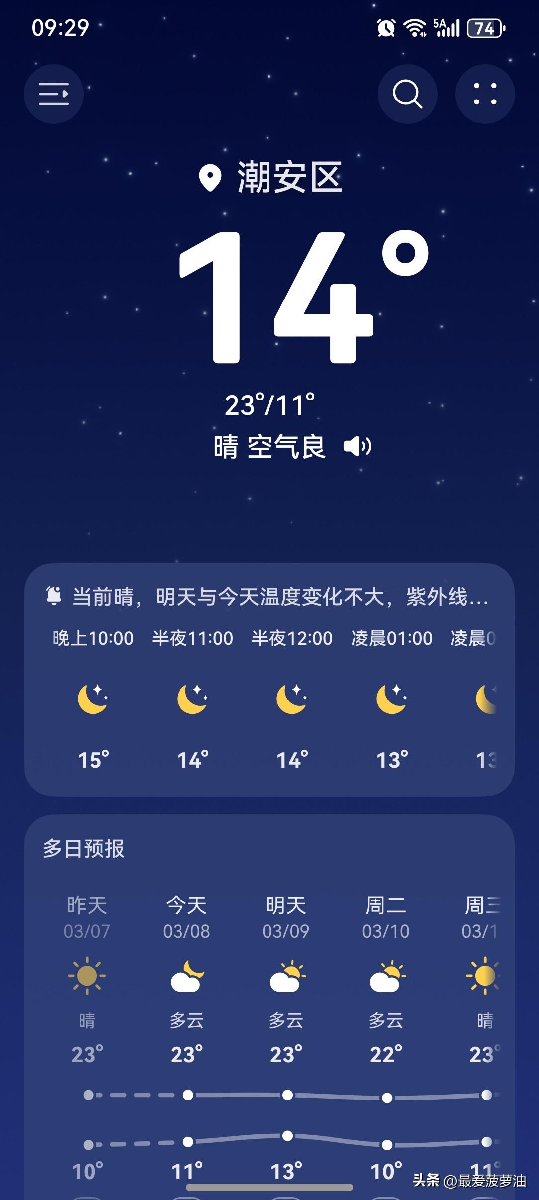 广东:明日弱冷空气到货,气温小幅下降,注意及时添衣保暖。 今天(8日),广东全省晴到多云为主;9~10日,受高空槽和冷空气补充影响,粤西北、雷州半岛市县有小雨,珠三角部分市县有分散小雨,其余市县多云到阴天;11日,全省大部多云到晴。 近期冷空气仍较频繁,气温多变,需要注意适时增减衣物,预防呼吸道感染等疾病。 今天(8日),潮州喜提一个多云天气!气温11~23℃,此刻气温14℃,体感温度11℃。 今天的天气凭实力获得一波五星好评!阳光明媚,气温舒适,这绝对是一款最受欢迎的天气! 周末遇上女神节,可以说是算是喜上加喜啦!没想到再遇上一波好天气,更加增添了浓厚的节日气氛! 这么美好的春日时光,怎能让人不留恋呢?