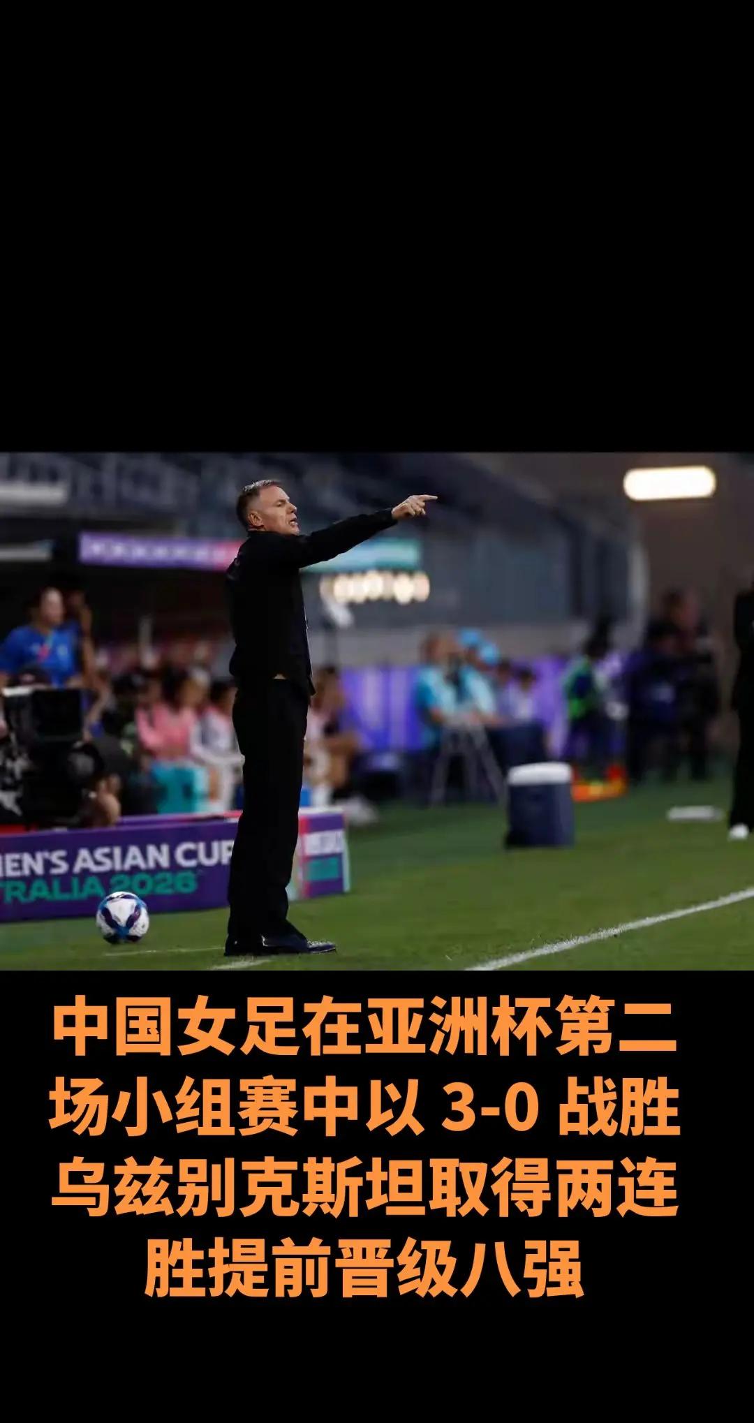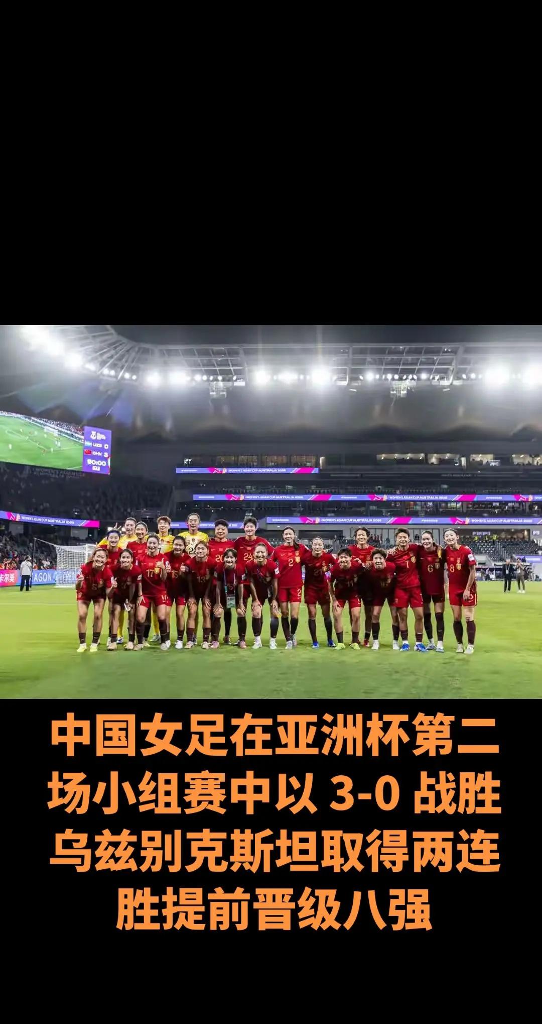 中国女足晋级亚洲杯8强。中国女足在亚洲杯第二场小组赛中以 3-0 战胜乌兹别克斯