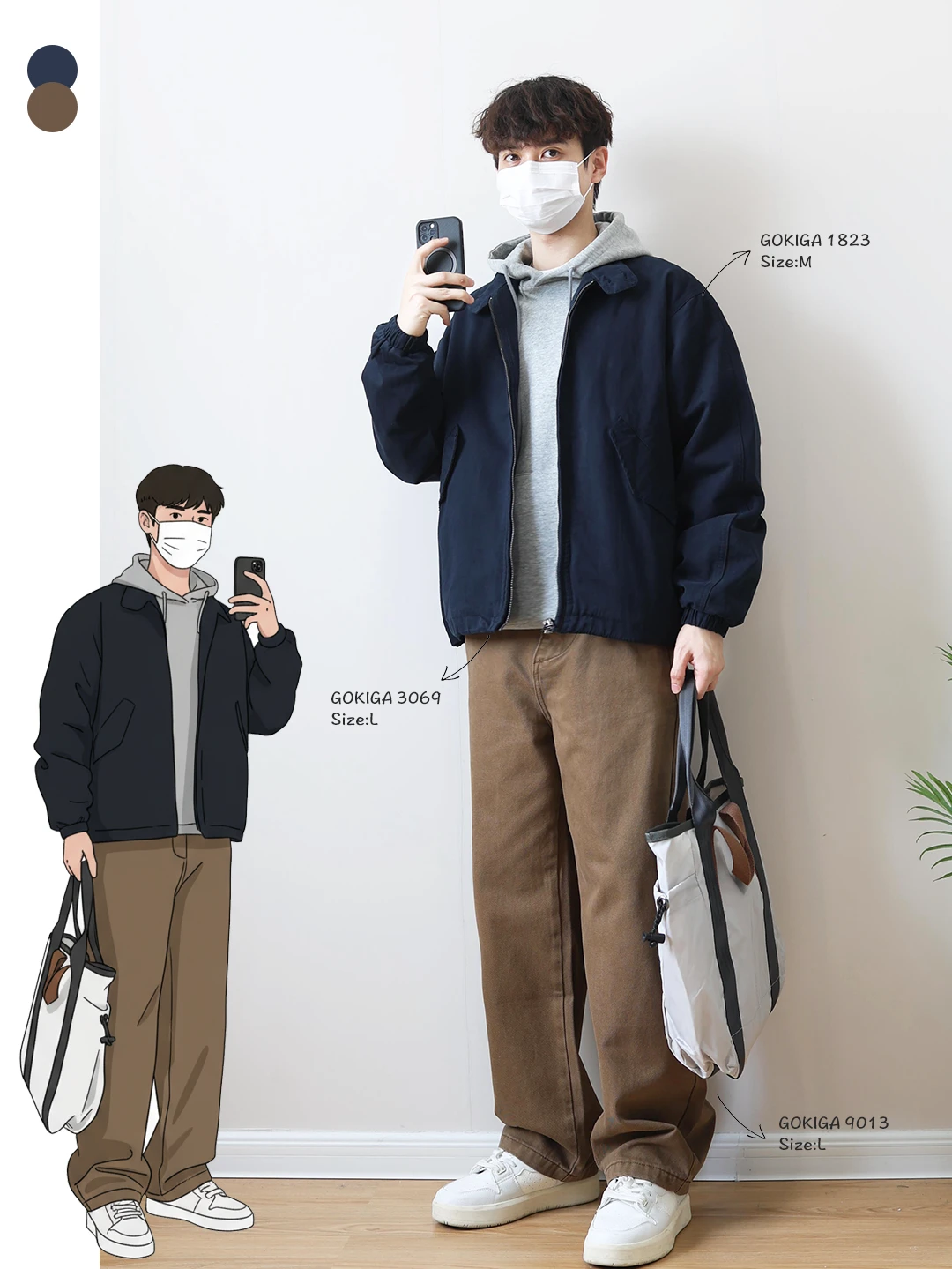 🔘藏青和卡其也是耐看的组合,低饱和度的配色看起来会比较稳重,适合通勤或者稍微正式一点的场合。
