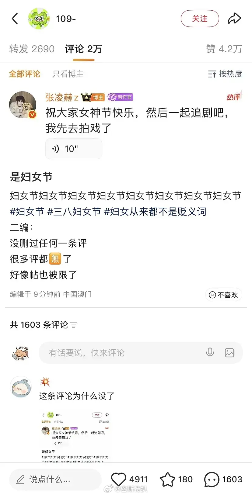 张凌赫在评论区因为说了女神节被骂了
