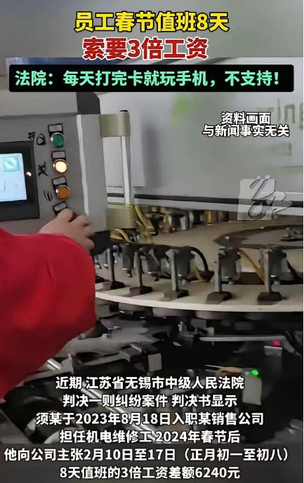 值班不等于加班?江苏无锡,男子为了挣3倍工资,大年初一到初八上了8天班,连家都没回,节后他找公司要8天的3倍工资6240元,可公司认为值班不等于加班,还说:你玩了8天手机,又没干活,哪有脸要3倍工资? 说真的,就算时间到了2026年2月,只要有人提起那年春节的那桩讨薪案,很多人心里还是会“咯噔”一下。 你以为劳工维权是一本清清楚楚的账?真扒开看,全是扯皮、拉锯、钻空子,甚至让人后背发凉的那种现实。 这事得从2024年3月的无锡说起。 工人须某,本来应该拿到一笔6000多块的春节工资。结果他打开手机银行一查,余额纹丝不动——一分钱没进账。那种感觉很难形容:守了整整一个春节,连回家吃口热饭都放弃了,到头来像白干。 愤怒、屈辱一下堵在喉咙口,吐不出来咽不下去。 再往前倒。2023年快过年的时候,公司贴了通知:春节期间需要留人看厂房,防火防盗。 大多数工友挤了一年都想回家,抢票抢到发疯,恨不得立刻走。偏偏须某在自愿表上签了字。不是他傻,是他算了笔账——按规定,春节值班如果算加班,工资是三倍。 他从2024年2月10号守到17号,整整8天。基础工资乘三倍,算下来6240块。对普通工人来说,这数字谁不心动?家里人也支持:少吃几顿团圆饭,换一笔钱,值。 看上去像“稳赚”。可最后就栽在一句话上——公司说:值班不算加班。 到发钱那天,人事直接把话说死:这不叫加班,这是“待命休息”。甚至还把那8天的监控录像调出来,指着须某在岗位上刷手机、打发时间的画面,来了一句很刺耳的反问:“你看看,8天你动过一根手指头吗?没干活,还好意思要三倍工资?” 这种话不是解释,是嘲讽。对一个干了多年技术活的人来说,刺激得很。 更尴尬的是,须某也不是第一次值班。 早在2023年8月18日,他就在待命岗位上接到过值班任务,用来防机器故障。正常来说,“没出事”应该是好事,说明看守到位。可现在反过来成了他的“罪证”:没出事=没劳动=你不配拿钱。 两套逻辑就这么撞上了:工人认为“人在岗、不能走、要承担风险,所以该算加班”;公司认为“没实际操作、没产出,就是待命,不算加班”。 最后只能把问题扔进法庭,让法条来切割。 法院的尺子也挺清楚:想拿加班费,你得证明自己确实在加班——最好有实打实的工作内容、体力或操作痕迹。像防火防盗这种看守性质的“值班”,很多情况下被认定为“待命”,不等同于高强度劳动。 更要命的是举证。须某手里拿得出的,基本只有“我在现场”的监控画面,可拿不出“我干了什么活”的证据。结果从一审被驳回,到二审上诉,最后还是没翻过来。 钱没拿到,春节也错过了,就这么完了。 这案子在网上一炸,立刻撕成两拨人。 一拨人替他憋屈:“这种春节守着、不能回家、要承担风险的苦熬,凭什么一句‘待命’就削没了?连补偿都不给?” 另一拨人更直接:“打卡坐着刷手机,零产出还想拿三倍?这不就是空手套白狼?” 吵到今天都没完全停。 但这事真不该当作旧闻翻过就算了。它更像一剂猛药,专治“以为节假日留守就必拿三倍”的想当然。 想赚节假日的钱,最好一开始就把话说穿:加班还是值班?工作内容是什么?钱怎么算?写进协议里,白纸黑字敲死。别最后变成“无名无姓的留守孤魂”,等坐到法庭上才发现,后悔都没地方后悔。