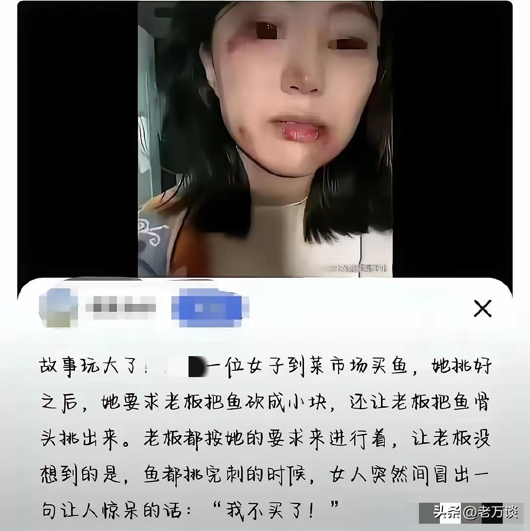 据网友透露,有这么一件事,真是让人匪夷所思:女子到菜市场去买鱼,挑好鱼之后,让师傅帮她剁成一块小块,并且要求师傅把鱼中骨头全部挑出来,余党师傅为了完成这单生意。对于女子所有要求,鱼档师傅照单全收,全部做好,然后叫女子拿好鱼付钱的时候,女子来了一句,我不要了,就要潇洒走人。鱼档师傅难以接受这样的情况,感觉自己被当猴子一样戏耍了,为此双方发生了冲突,女子不敌鱼档师父,被打的鼻青脸肿。这个是教导我们:做人不要太过分,不能把别人不当人,否则挨揍的就是自己,人与人之间要学会尊重。如果自己不会做人,那么别人就会叫他来做人。让人很疑惑,真的会有这样的人?