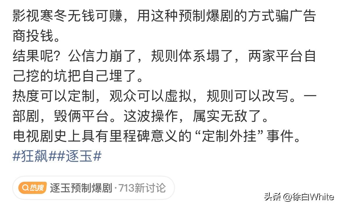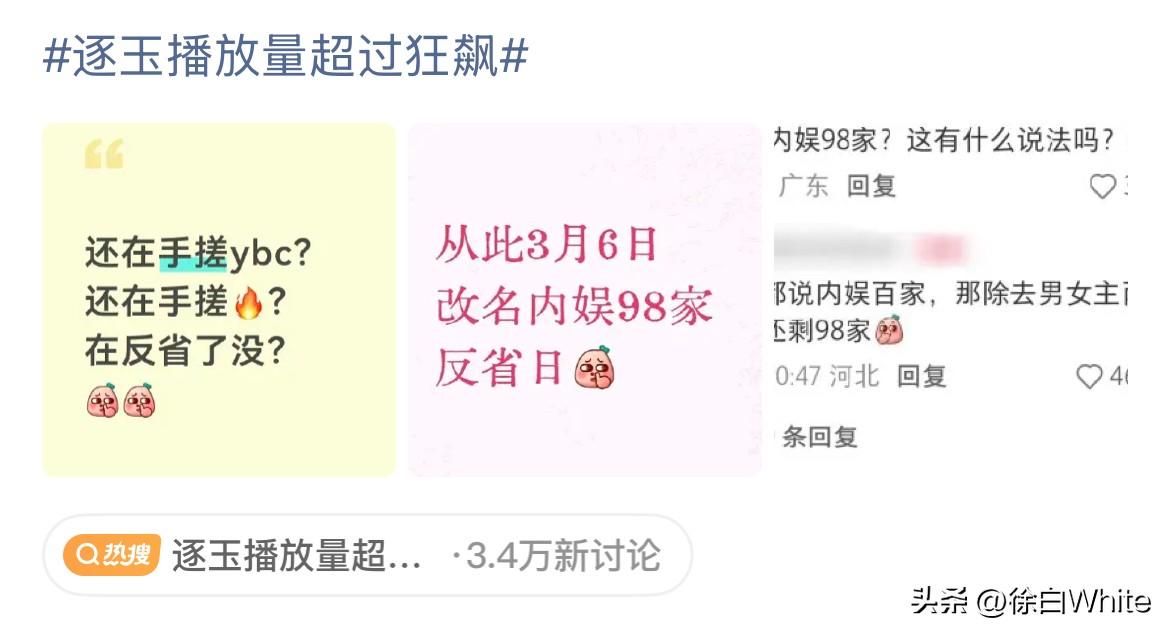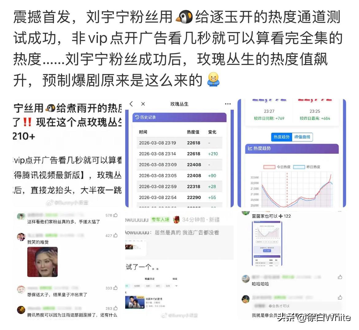 3月9日,视组发现🐧为助长《逐玉》热度开后门,看1秒算看全集的播放量! 今晚听到消息的各家熬夜“喝汤”手搓热度,首当其冲的是赵丽颖家,只不过搓到一半发现《小城大事》热播期过了,喝不上汤了!不过这也没有打消大家冲bug手搓自家剧热度的决心,看来大家真是被《逐玉》这波操作给气到了!感觉明天有好戏看了,所有剧集体涨热度,其实我觉得不如所有人把劲用在一部剧上,直接给它冲破万了,最好35000,这才是最打脸的!